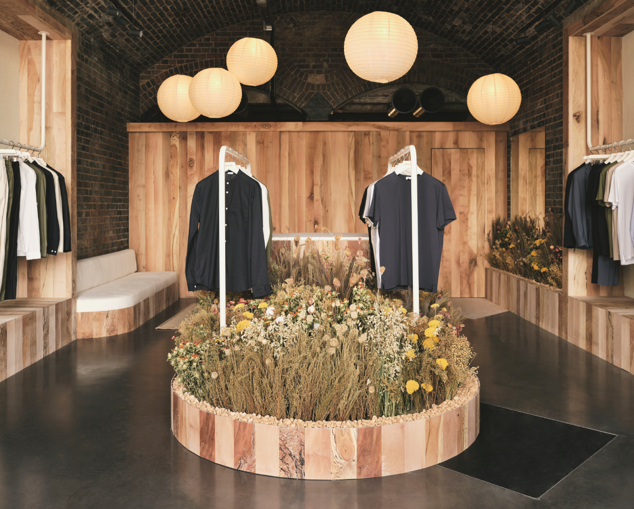 Working alongside biophilic design specialist Oliver Heath, designer Fred Rigby adopted a regenerative approach, combining natural textures with locally sourced and repurposed materials, subtle colour accents, sensory elements and abundant biophilia in L’Estrange. Rigby cocooned and partitioned the menswear store using repurposed wood from London planes trees sourced from Fallen & Felled, who transform storm-stricken and diseased trees into hardwood timber.