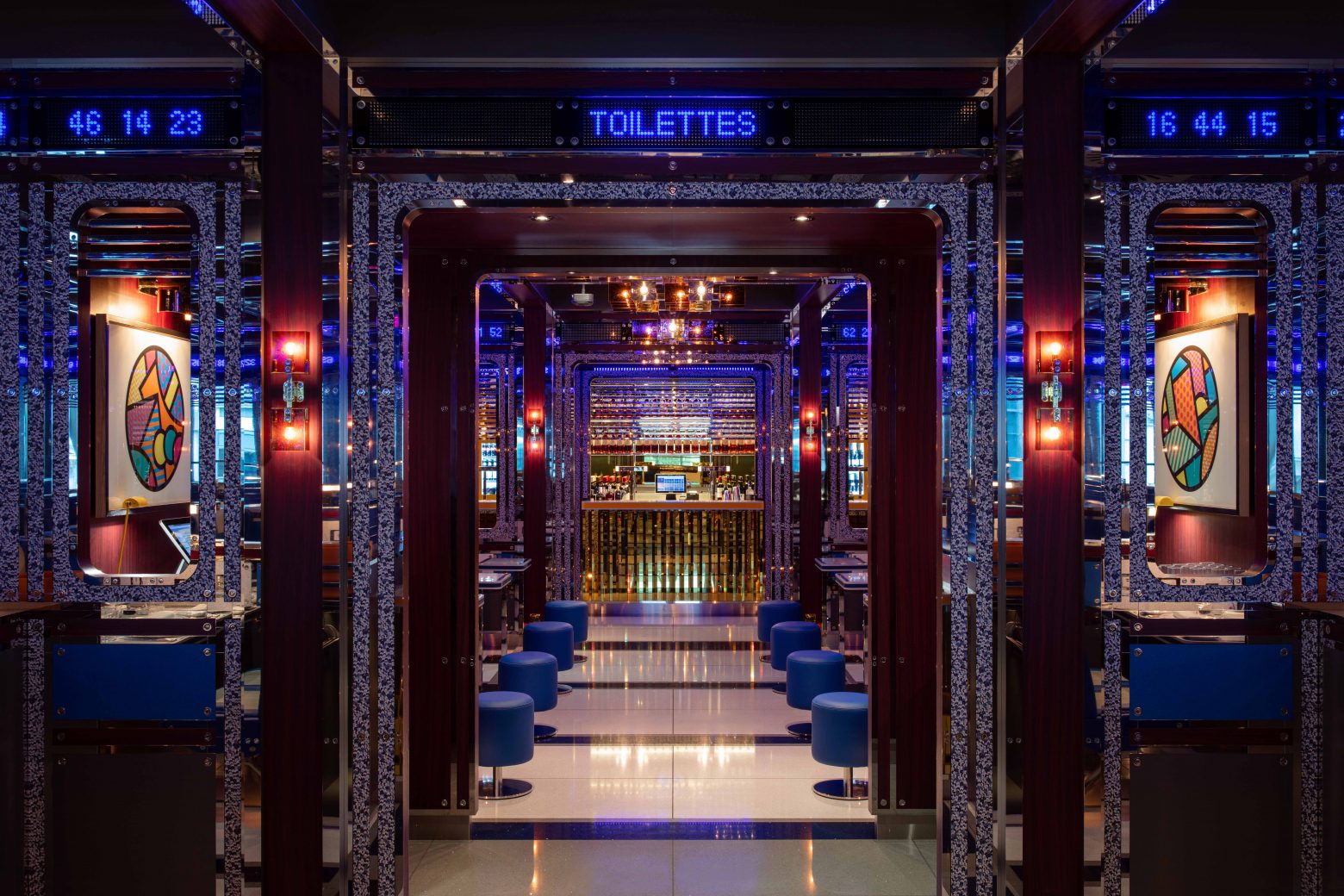 The instantly recognisable ‘Pressez pour les Champagne’ button activates a table number illuminated throughout the space, and in an homage to its London home, ticker-tape wraps the facade of the restaurant and internal dining rooms.