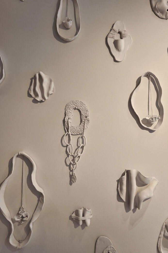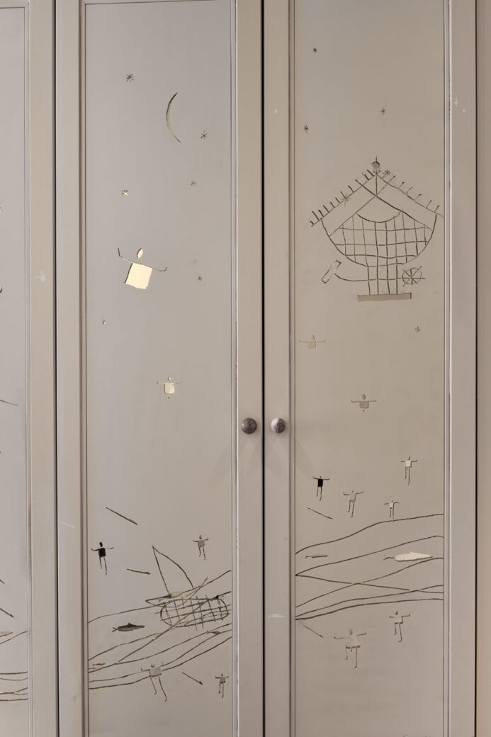 Occupying Suite 242, D/DOCK’s own contribution to ‘t Hyus is unexpectedly minimalistic and pared back in style. The studio opted for a deliberately neutral palette of cream and grey with few immediately obvious adornments (save for a selection of ceramic items), striving to create almost a liminal space encouraging guests to make their own interpretations of the suite and indulge their curiosity. The entrance corridor is home to artworks representing masculinity and femininity, with a wall installation titled ‘Viva la Vulva’ showcasing ceramic abstract shapes of the female anatomy. Opposite, the paint on cream storage cabinets has been scratched off to create a symbolic ‘cave wall’, filled with drawings telling the stories of early hospitality rituals.
