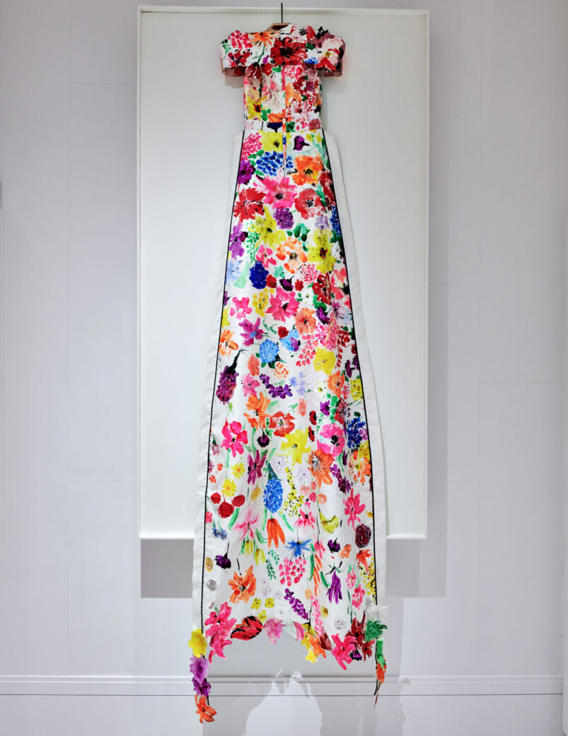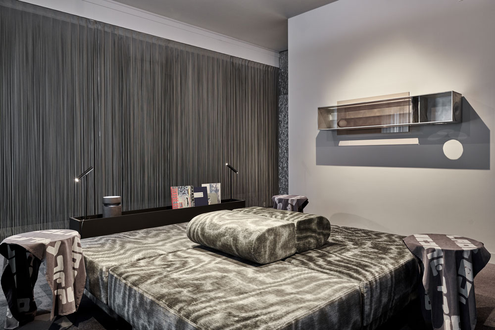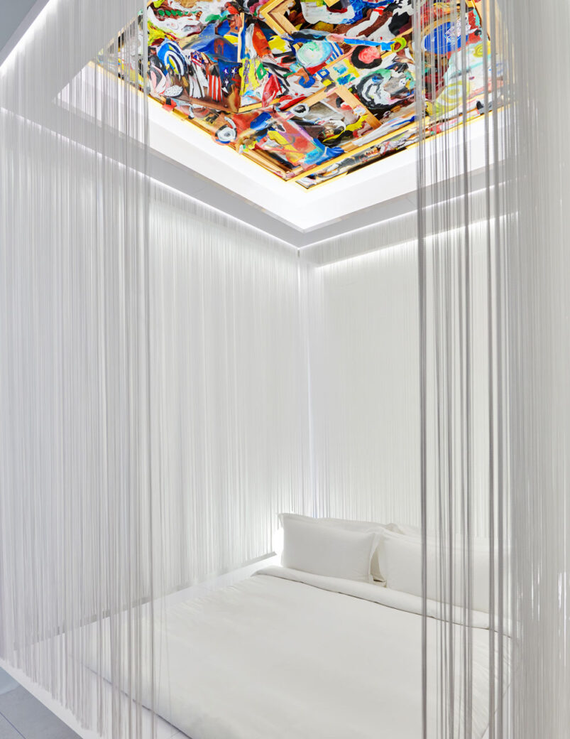 Celebrating the mind behind the world’s first sustainable couture label, The RKDV Suite was designed as an ode to fashion designer Ronald van der Kemp. The scheme contrasts crisp shades of bright white with busy, vibrant collages of van der Kemp’s work, inspiration, sketches and photographs: for instance, a sculptural, custom bed clad in all white sits beneath a colourful ceiling artwork designed by RKDV using material offcuts from the fashion industry. Striving to be a multi-use space, the bed can also double as a pedestal and container for van der Kemp’s pieces during events such as design exhibitions.