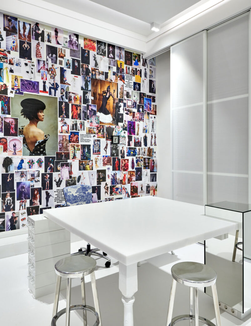 In the living area, an atelier table has been crafted using upcycled components, with a plain white top resting upon second-hand items including two vintage cabinets, a table leg and a mirrored pillar. This space was envisioned as van der Kemp’s own ‘creative nest’, emulating the workrooms where haute couture portfolios are brought to life within some of the world’s most famous fashion houses.