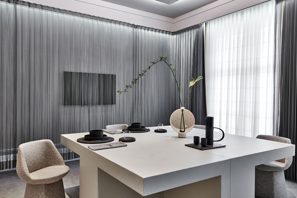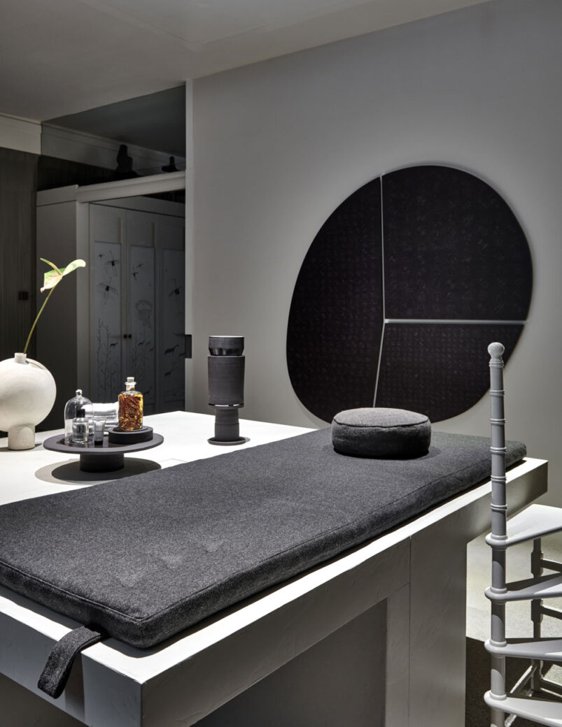 The two interconnected rooms within are described as the yin and the yang: one features a central, multi-use block that can act as a table for private dinners, a workspace or a surface for practicing spa treatments, while in the other features a soft altar can transform into a bed or serve as a space for reading, meditating or simply relaxing.