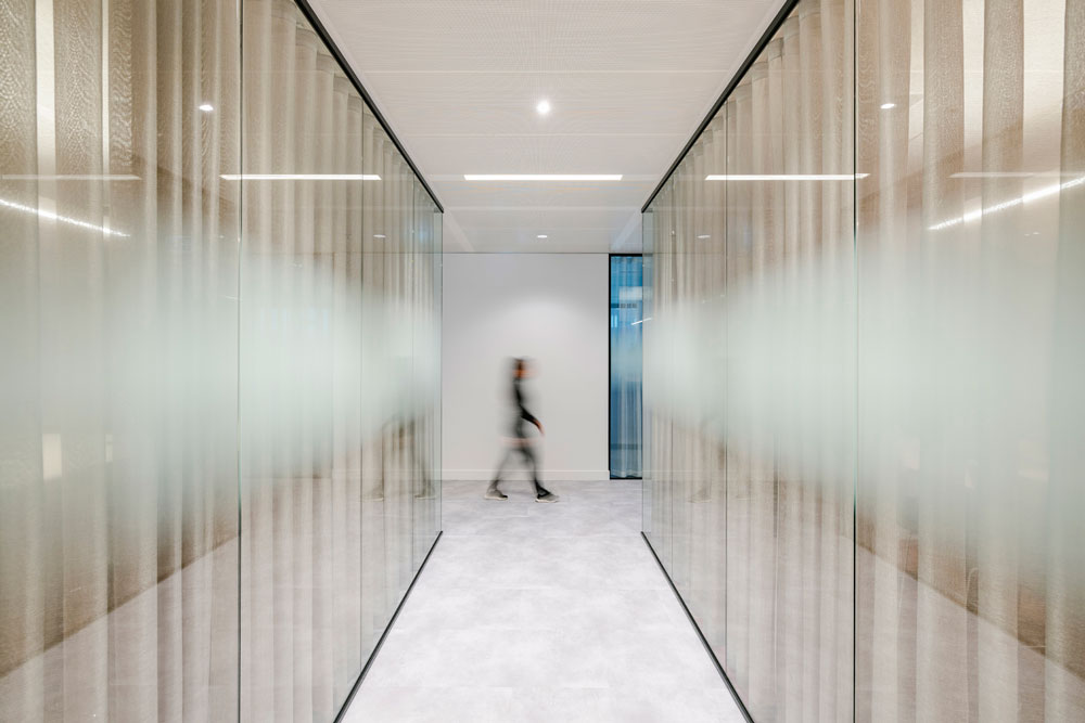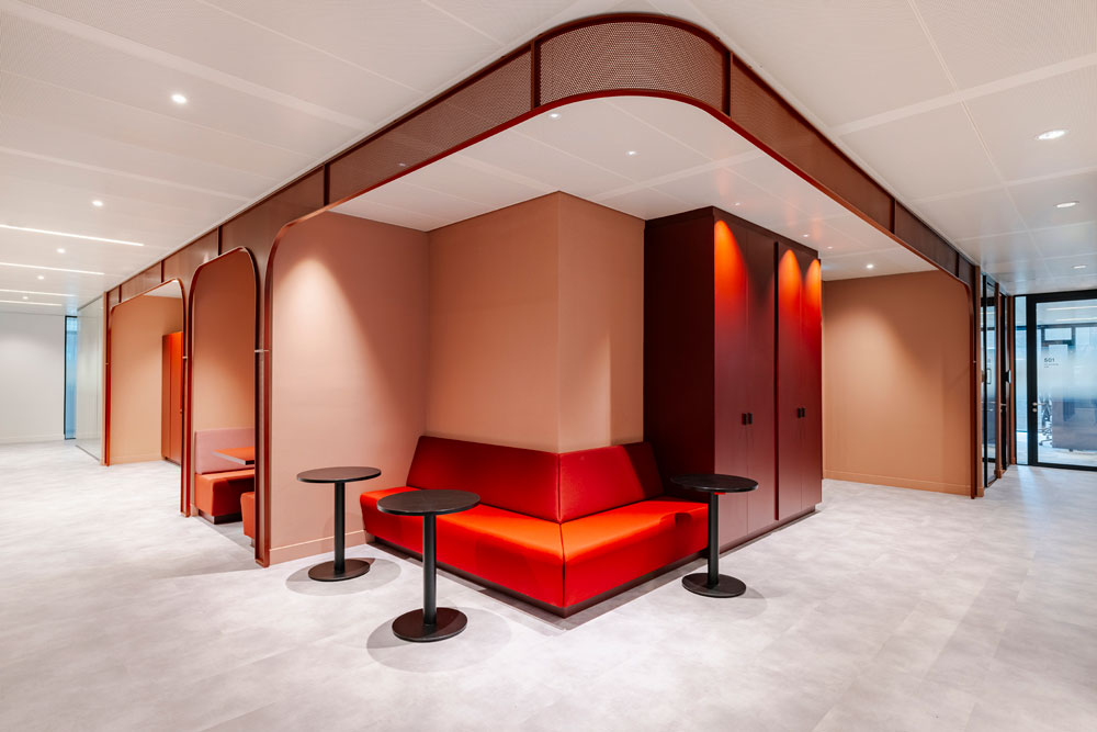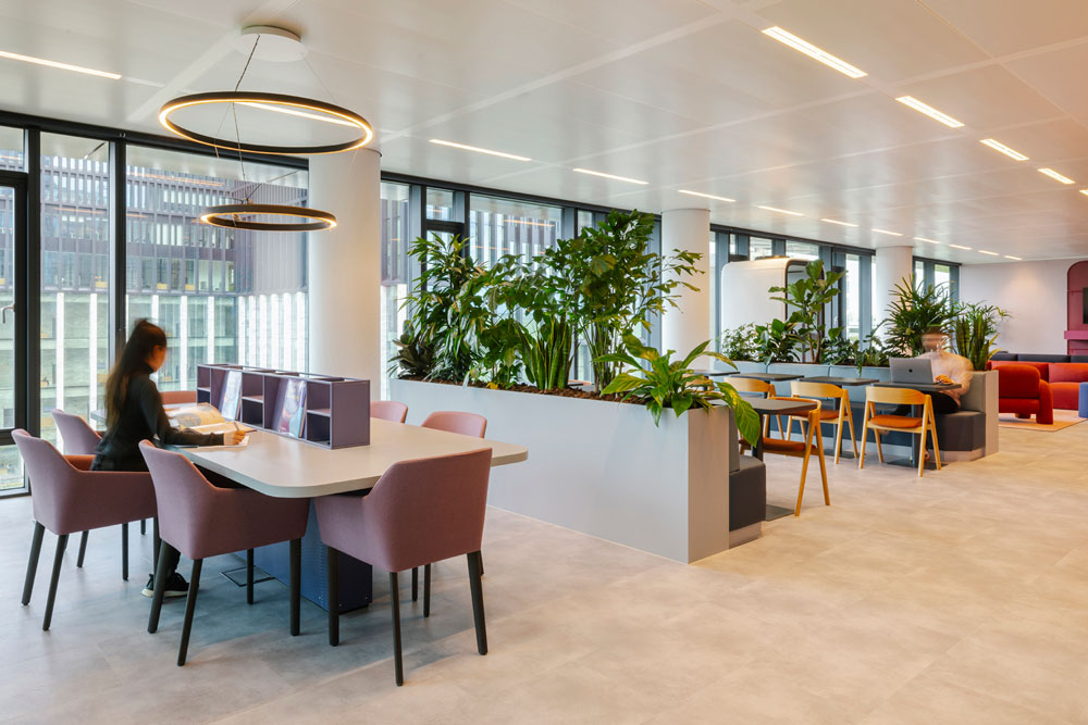Catering to multiple working styles and a diverse range of employee needs, the lower floor has been designed with the aim of promoting social interaction and fostering a positive, engaging company culture for staff and visitors alike. The lower floors therefore feature warm, inviting lounge areas, versatile multifunctional spaces and informal meeting rooms, characterised by boldly coloured upholstered furniture and verdant planting. Meanwhile, the upper floor is dedicated to dynamic, collaborative hubs that facilitate effective teamwork, provided by sleek, curved booths and banquette seating, illuminated by overhead task lighting.