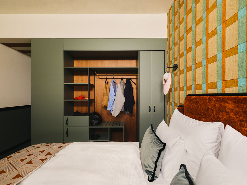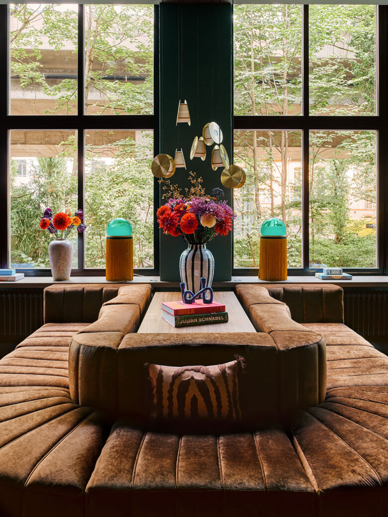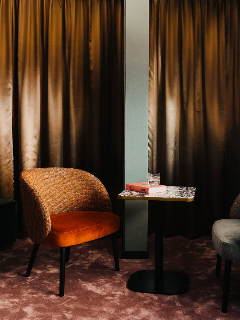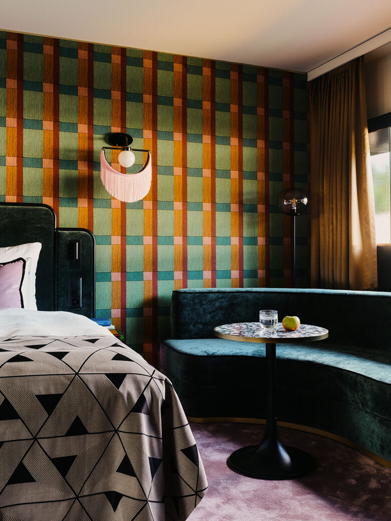 Featuring an earthy colour palette with bold accents, the property’s common spaces, 132 guestrooms and six suites are abundant with moments of surprise and discovery. A heavy use of textiles is a common element throughout, which, alongside the walnut veneer framing the windows, tie the spaces cohesively together. In the rooms, plush Ogeborg carpeting marries existing terrazzo floors, whilst suites benefit from custom curved sofas upholstered in copper-coloured velvet. These stylistic choices are complemented by London Art wallpapers, the optically scintillating patterns playfully layered with tasselled sconces by Houtique.