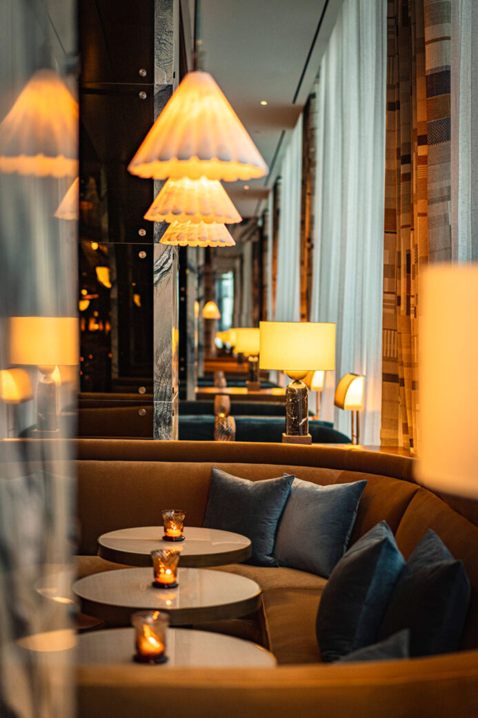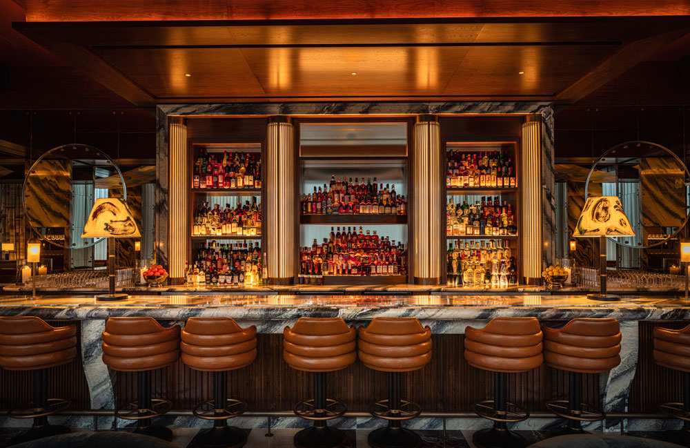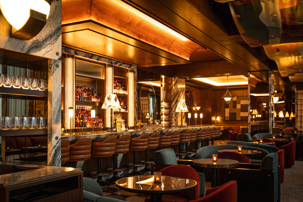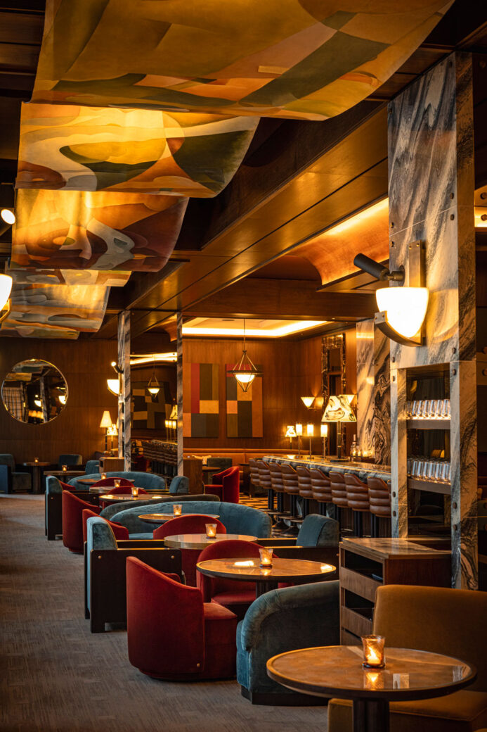 Here, cream and maroon chequerboard tiles meet honey tobacco carpet and velvet banquette seating, creating a layered, luxurious atmosphere that beckons you to stay a while and share a drink. A rich palette of navy blue, burgundy and ochre receives a dash of texture from basket-weave leather bar stools, while the bar itself is crafted from bronze, polished walnut, and Cipollino marble in white, pink and green. Draped above said bar is a 96-foot-long mural, hand-painted by American artist Dean Barger, which depicts an abstract interpretation of Chicago’s skyline, river, and architecture as an impressive nod to the bar’s local surroundings.
