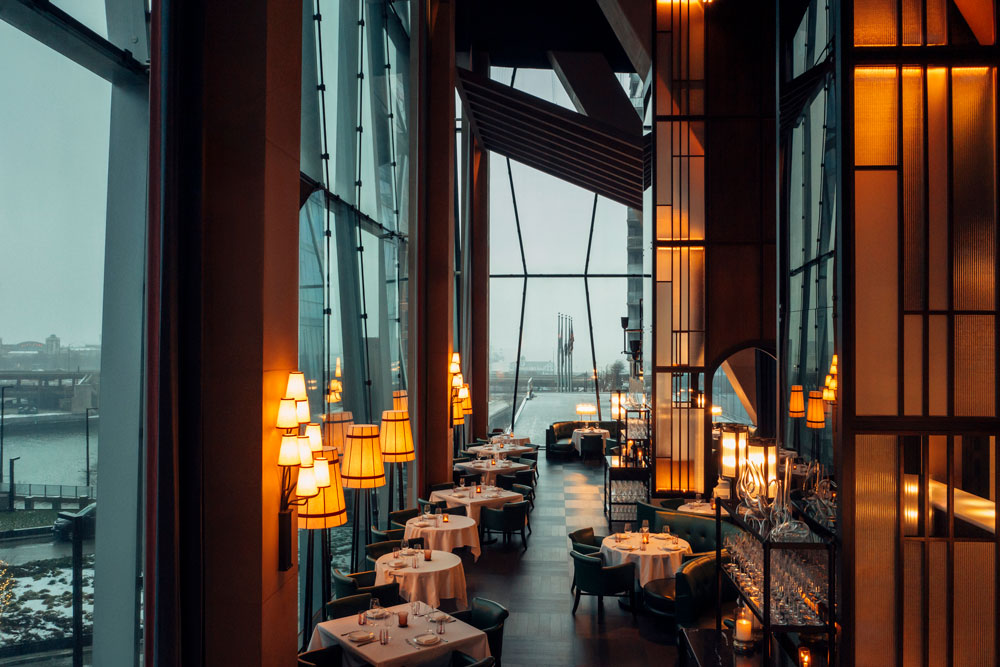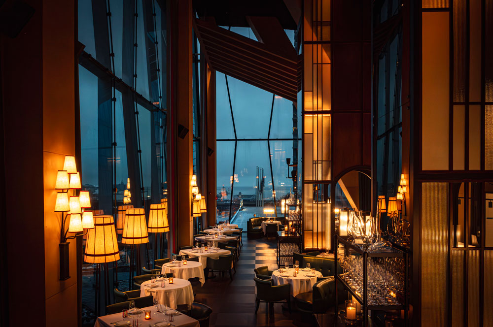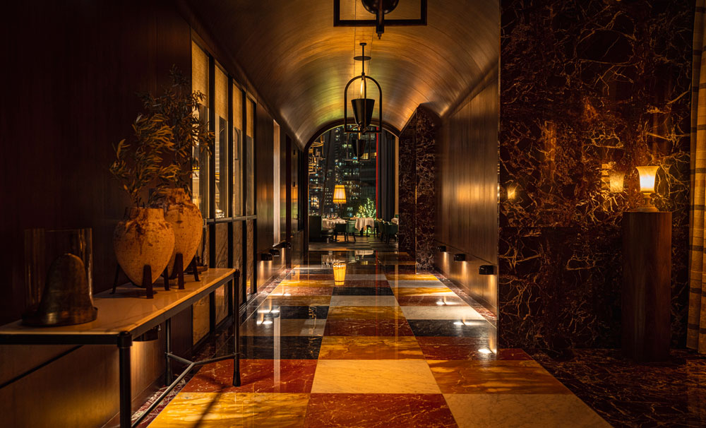 Stepping into the double-height main dining room (occupying 3,200 sq ft), the studio achieves a dramatic, almost gothic atmosphere through the use of architectural columns, arched portals, dark chequerboard flooring, walnut panelling and wrought-iron light fixtures. Leather banquettes are upholstered in forest green and deep blue jewel tones, while 40ft-tall linen curtains frame the striking floor-to-ceiling windows. Those looking for a more intimate dining experience can also book a private dining room on the mezzanine above, which seats up to 40 guests and overlooks the main restaurant below.