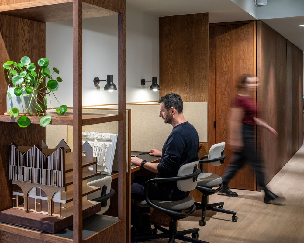 “Working with dMFK again on an office interior has given us the chance to bring our residential experience into the mix,” says Gemma White, partner at Sher + White. “We have created a warm, calm interior that fuses the practicalities of office use with residential materiality, detail and scale – the result is an office space that rivals any home working environment.”