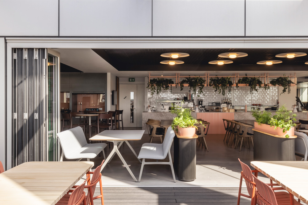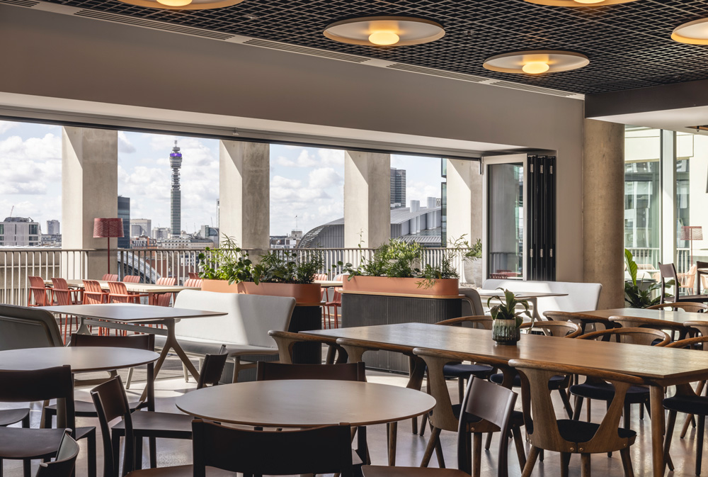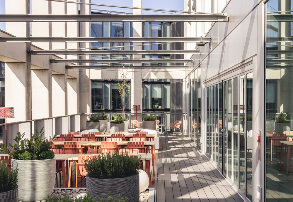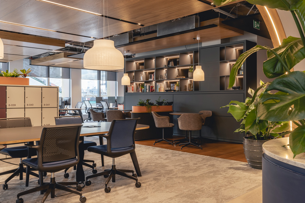 In the large café and social area, a mix of soft and wooden furniture is complemented by mobile planters on castors, tying in with the material language of the workspace and allowing the space to be fully flexible for the various town halls and client events. Huge bifolding doors open out to a large balcony, with plenty of outdoor and transitional furniture and incredible panoramic views of the capital.