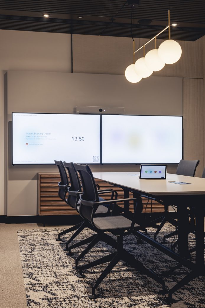 Each variation of meeting room has its own look and feel – from private quiet spaces to two, four and eight person rooms, and a larger flexible event space with bi-folding doors. Warm shades of burgundy and grey sit against timber panelling and textured carpet: “We put a lot of effort into making sure the meeting rooms didn’t feel too corporate,” says Interior Designer Ellie McCrum. “It doesn’t necessarily have to shout, but it all hangs together really well. We wanted to bring that same love [to the meeting rooms] that you’d give to a café or tea point.”