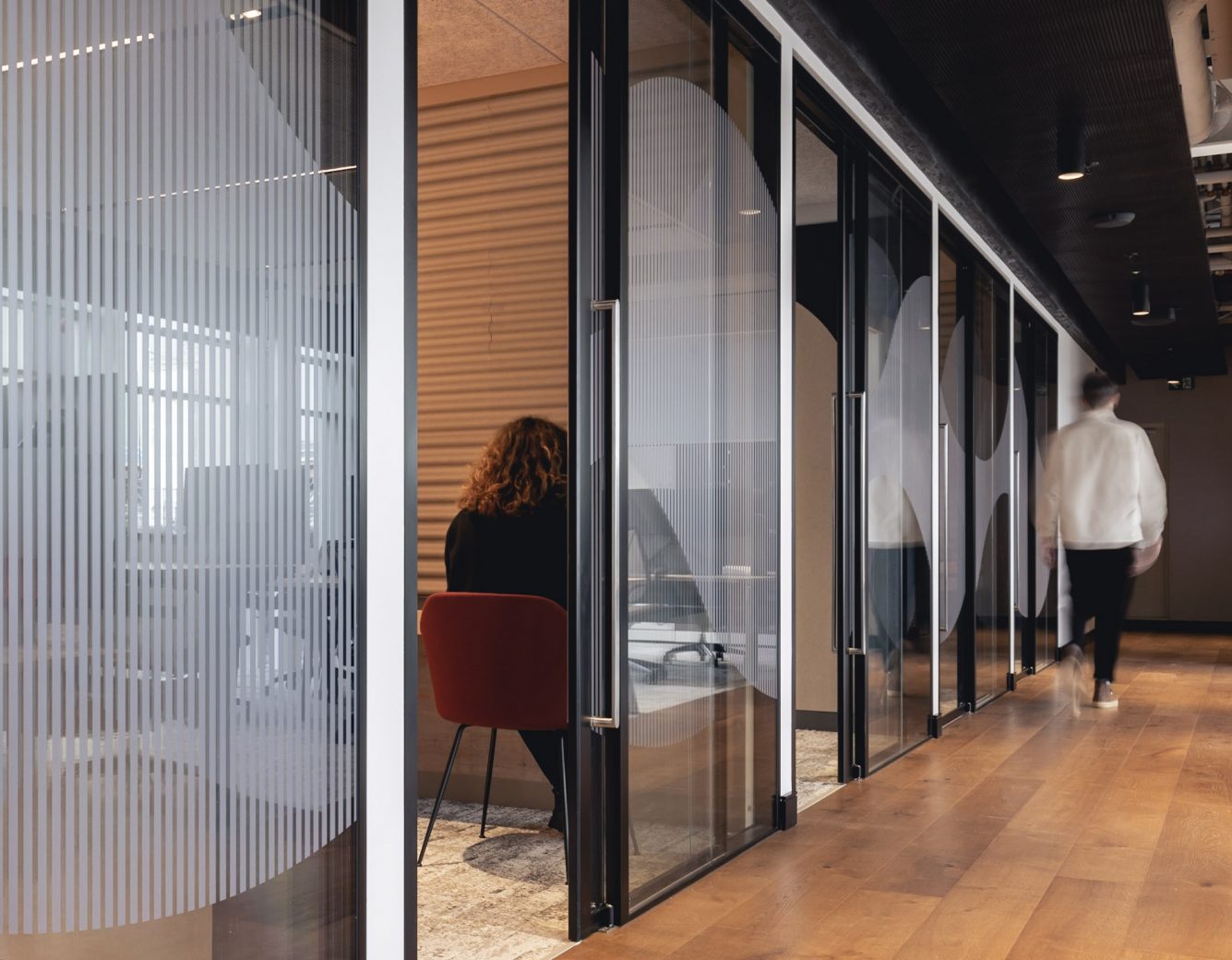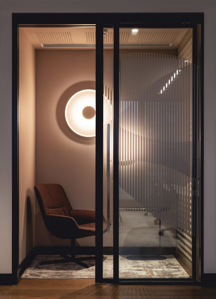 Moving inside from the hustle and bustle of the external square, the reception space is bright and comforting – not quite what one would expect from a biopharmaceutical company; warm neutrals, soft zoning curtains and modern details nod to residential design. A bright, open-plan office stretches around meeting rooms set into the middle of the space, allowing staff to be close to the full-height windows and natural light.