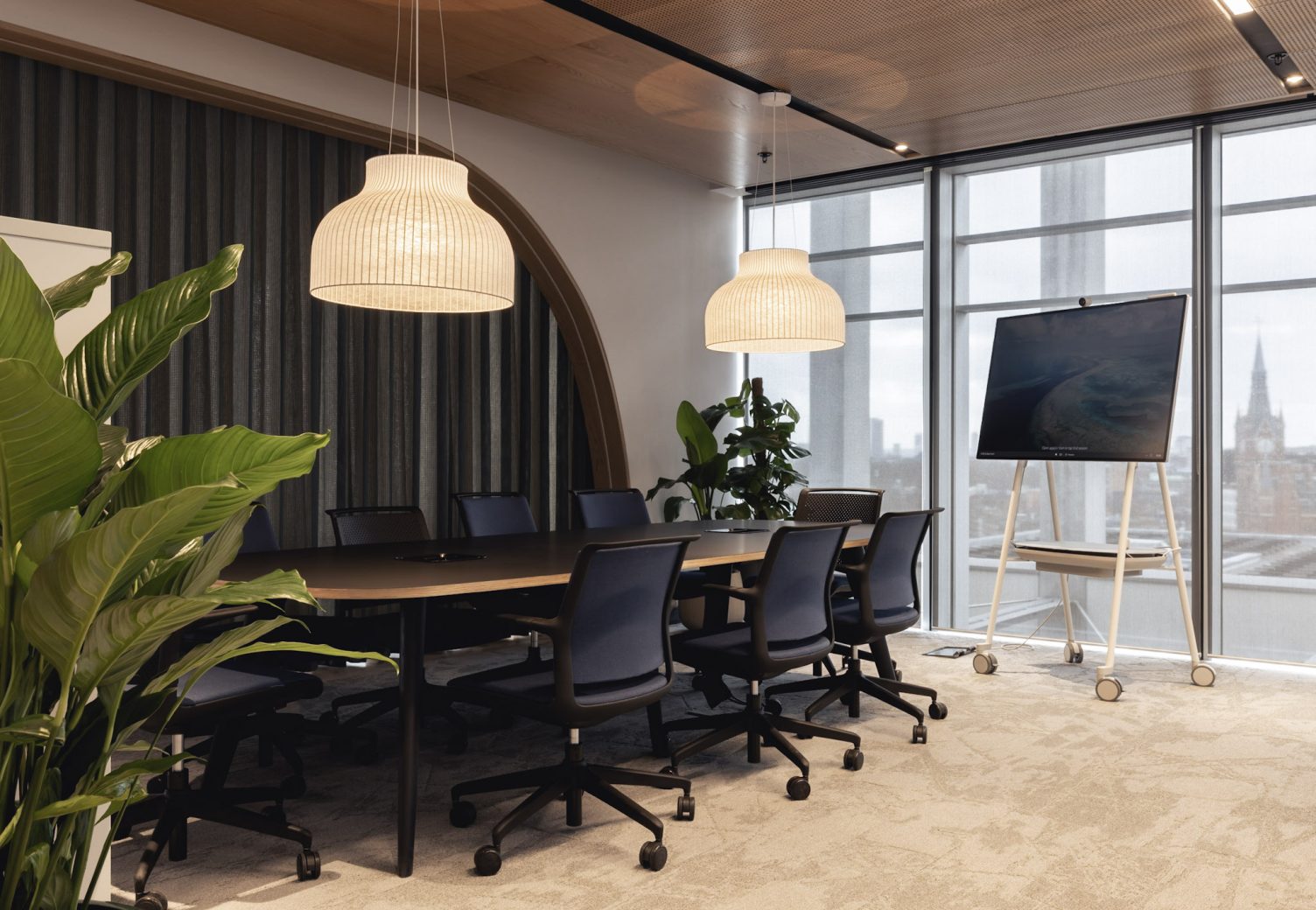 In the main office space, suspended ceiling systems have been cleverly modified and designed by Ekho Studio to mimic mesh, offering an impactful finish within a strict budget. Timber flooring from Tedd Todd sits alongside carpet from Milliken and Shaw, guiding visitors and staff throughout the main flow of the space. A breakout space acts as a transition between more traditional workstations. A bespoke ribbed wood and marble coffee bar sits under a curved frame with integrated illumination – the lighting and materials within this more relaxed space offering a distinct hospitality feel that the client was keen to explore.