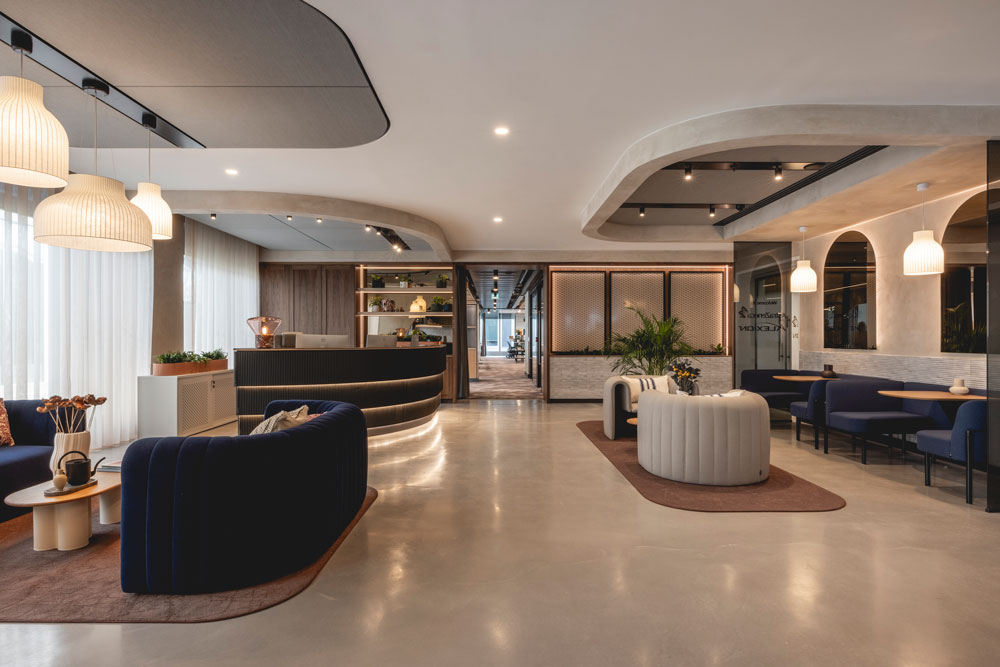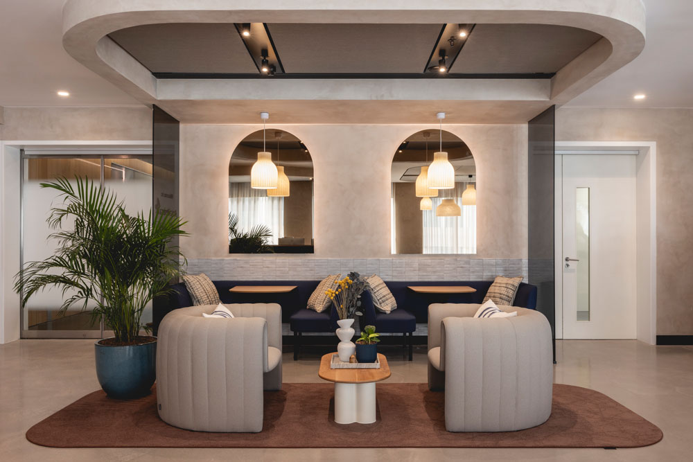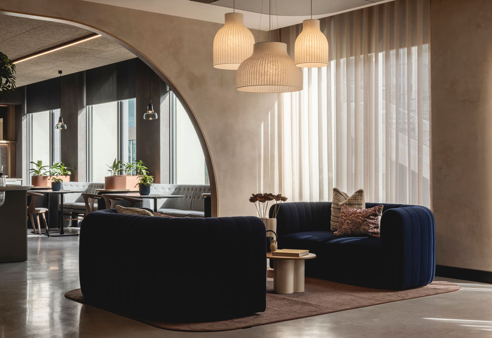 As a pharmaceutical company helping those with rare diseases, a focus on health and wellbeing features largely throughout Alexion’s new design scheme. Aiming to create a calm, soothing, and altogether elevated working environment, Ekho Studio paired deeper timber tones with pink clay, as well as soft, carefully considered lighting to curate an inviting, welcoming space for employees and clients alike. “The principle of curves and rounded edges inspiring calm is well-established,” explains Sarah Dodsworth, founding partner at Ekho Studio. “We really embraced that on this scheme, incorporating rounded furniture, from sofas to chairbacks and incidental tables, together with curved joinery. We also created curvature across interior dividing walls to soften transitions and create more intriguing sightlines.”
