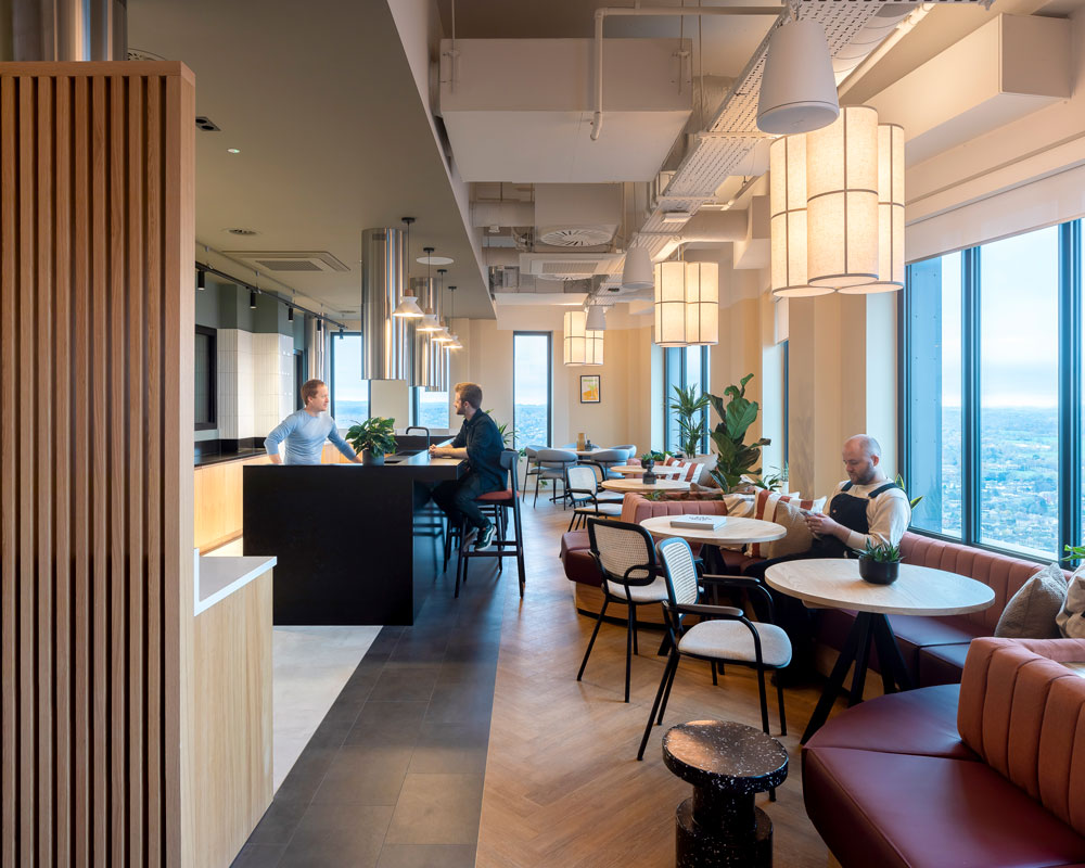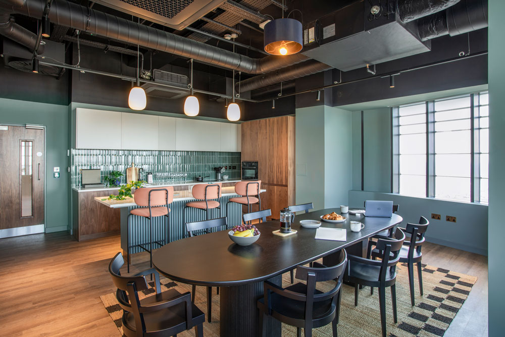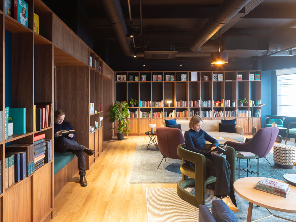 The coworking floor incorporates a large reading room, with adjacent large meeting rooms, each with a coffee point and mix of seating. The banquette window seat and low level worktables follows the façade and leads users through to a social kitchen and tea point and softer lounger seating.