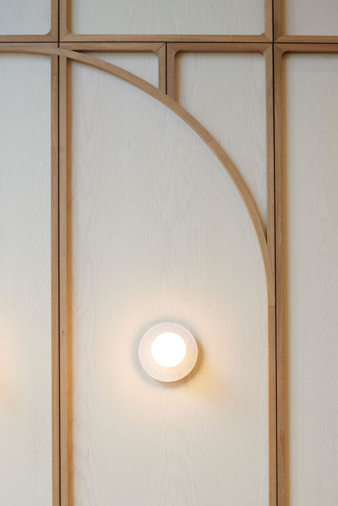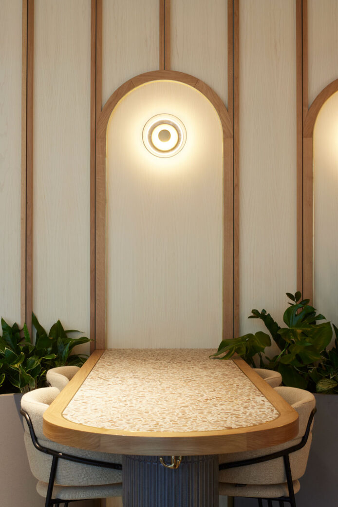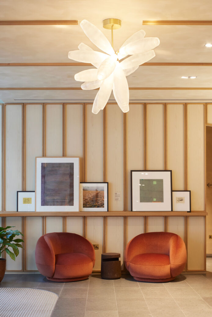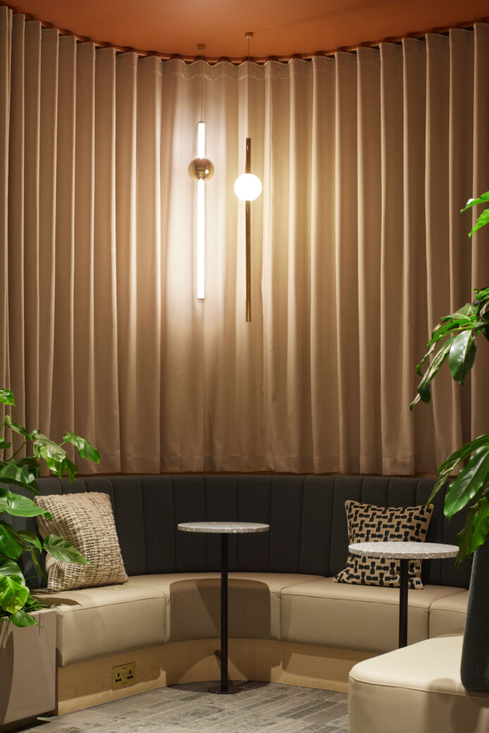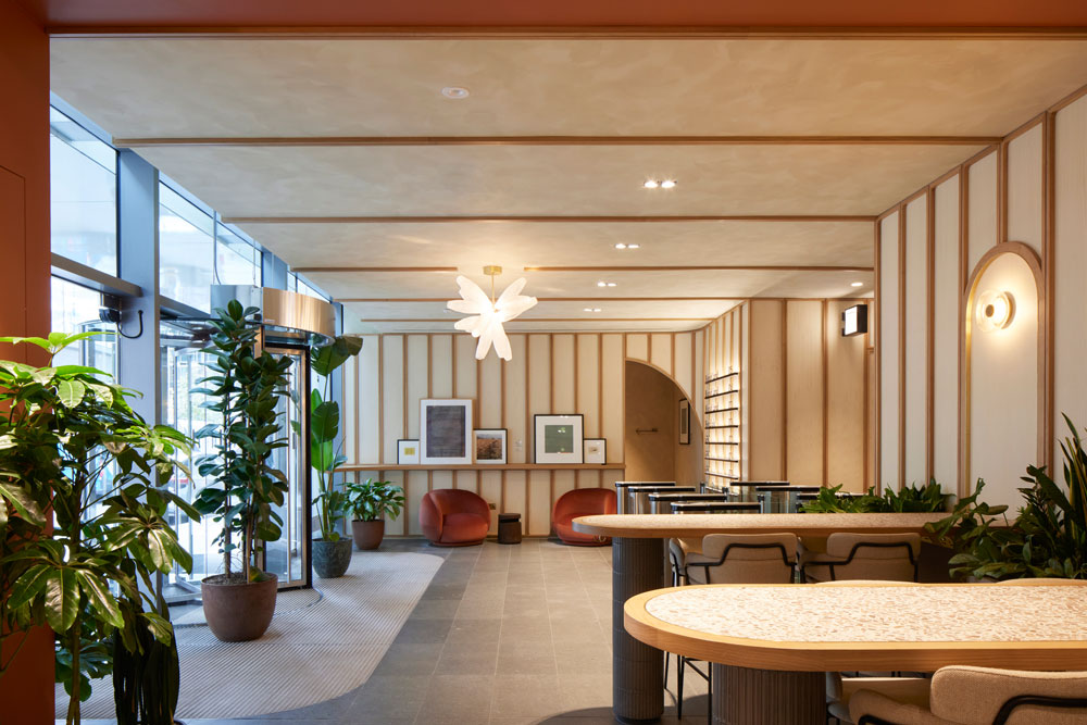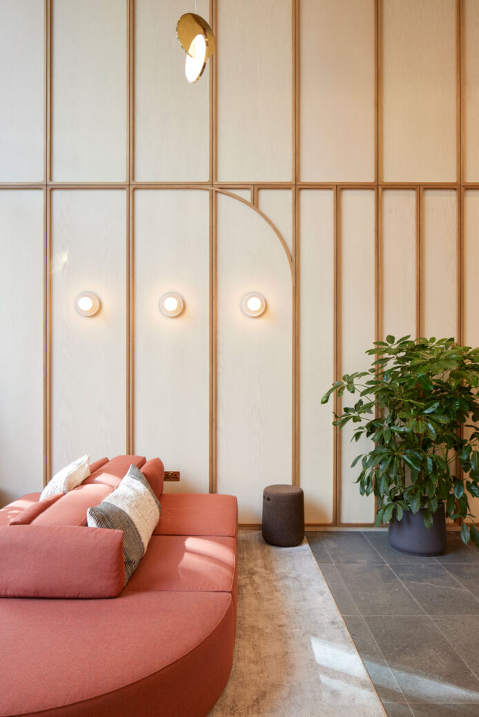 This wall panelling acts as the leading motif within Feix&Merlin’s design concept for the two reception areas, and continues throughout the lobby, breakout spaces and lifts to create one cohesive interior landscape – as well as soften the whole scheme with rounded corners. The studio drew from the existing architecture of the space and the building’s geometry to craft the all-encompassing panels, which were made from sustainably sourced wood. Other natural materials were also prioritised to maintain an environmentally conscious and biophilic approach, including breathable limewash finishes, recycled timber terrazzo and cork. Décor and furnishings were chosen on a similar basis, such as the wide selection of air purifying indoor plants and new upholstery, which includes natural rugs and vegan leather and drapery.