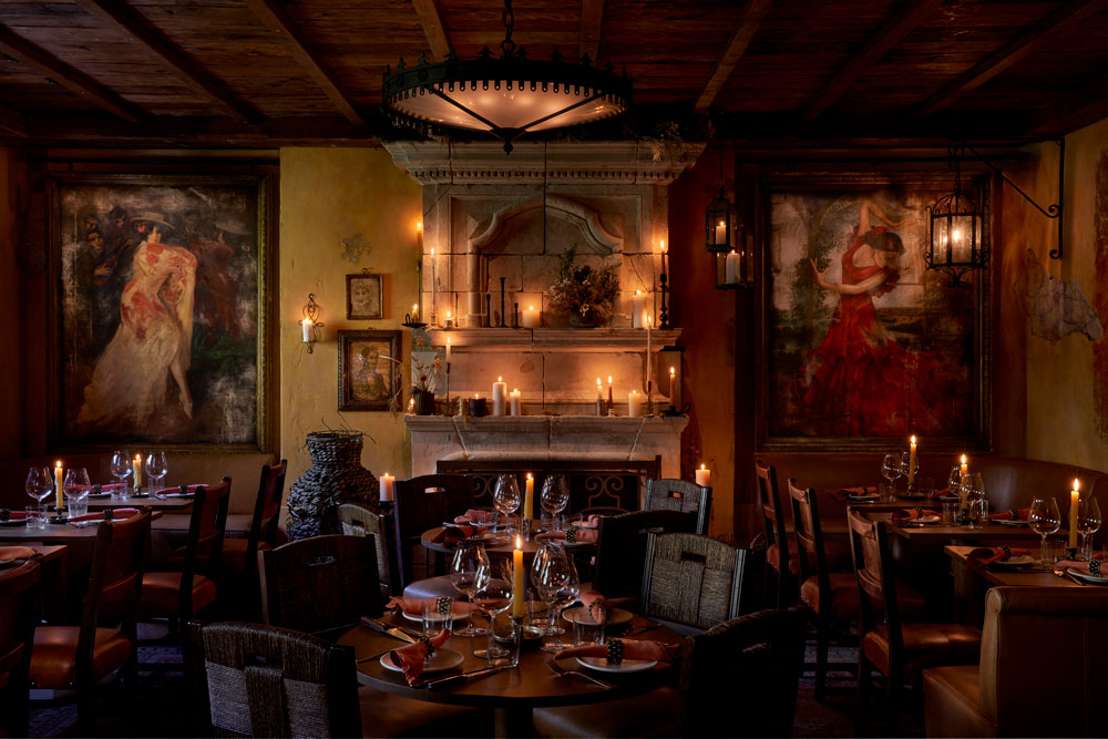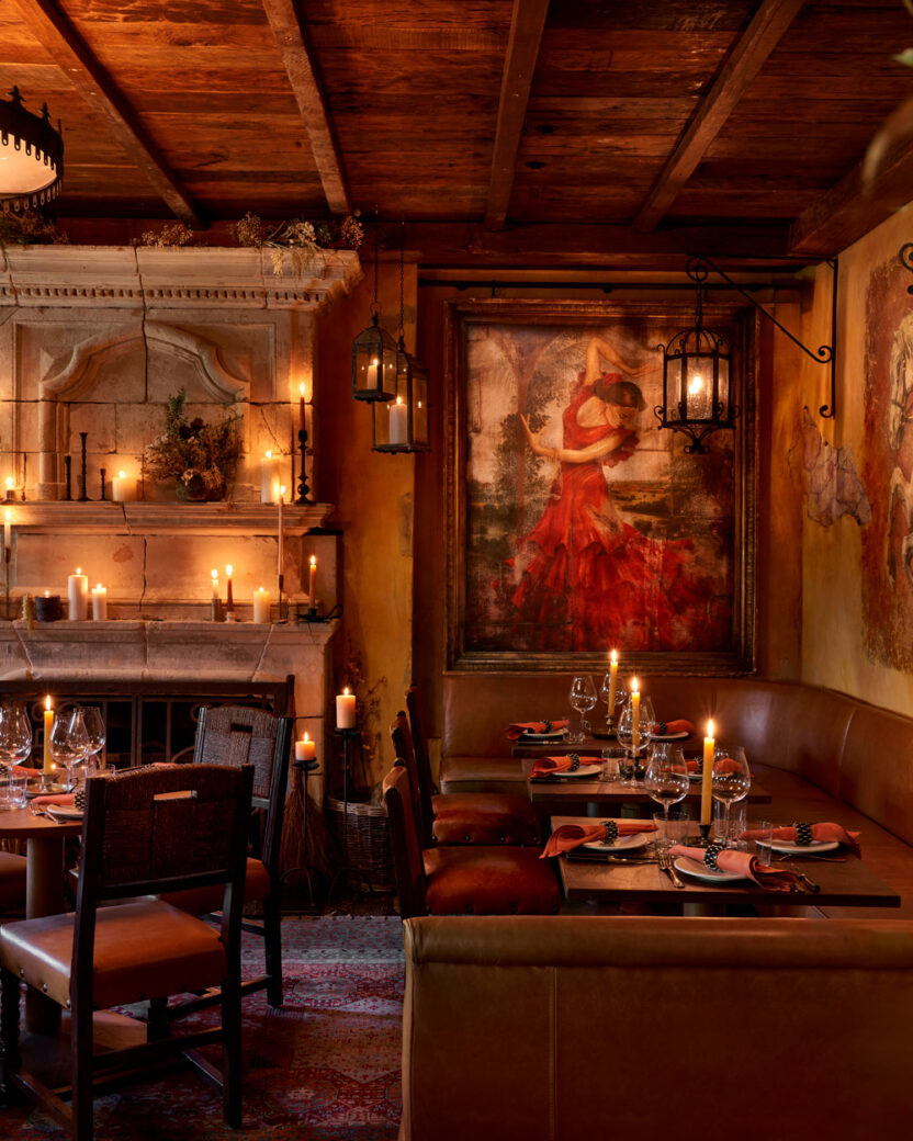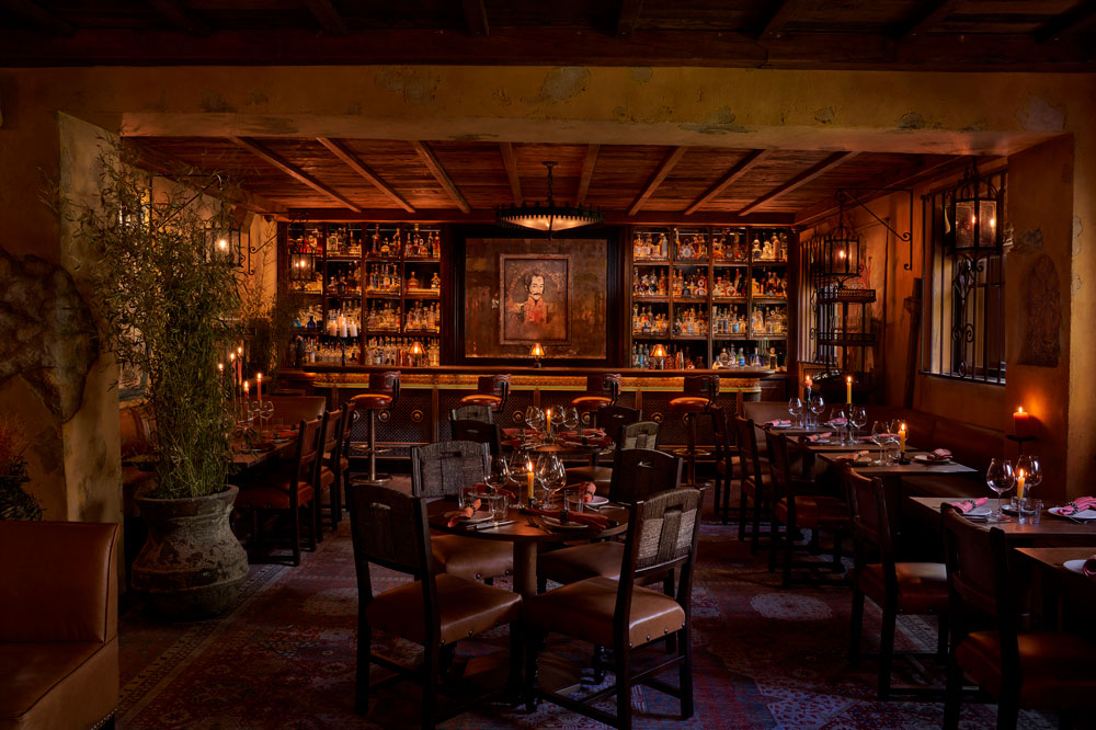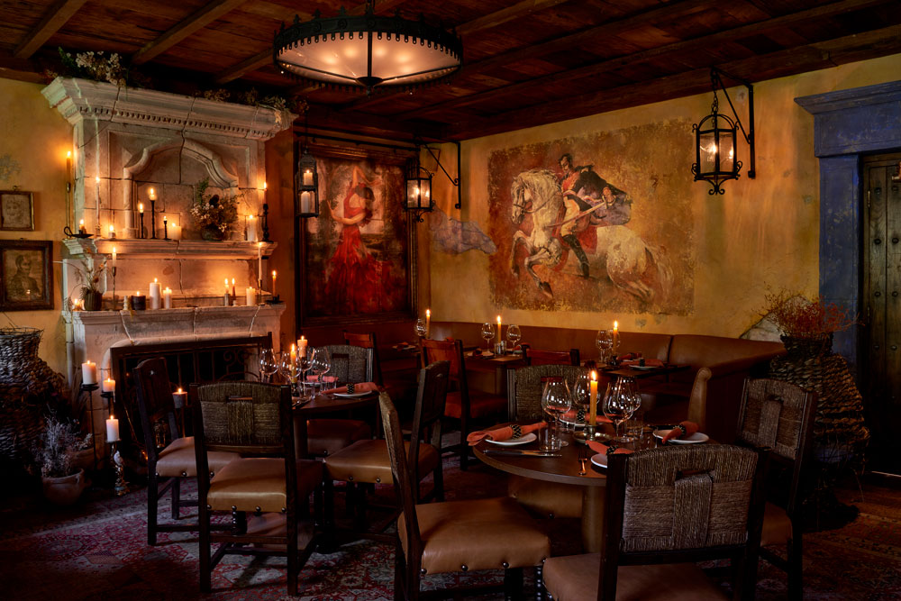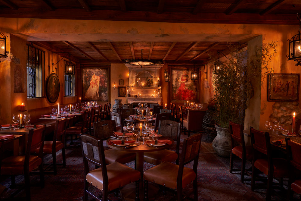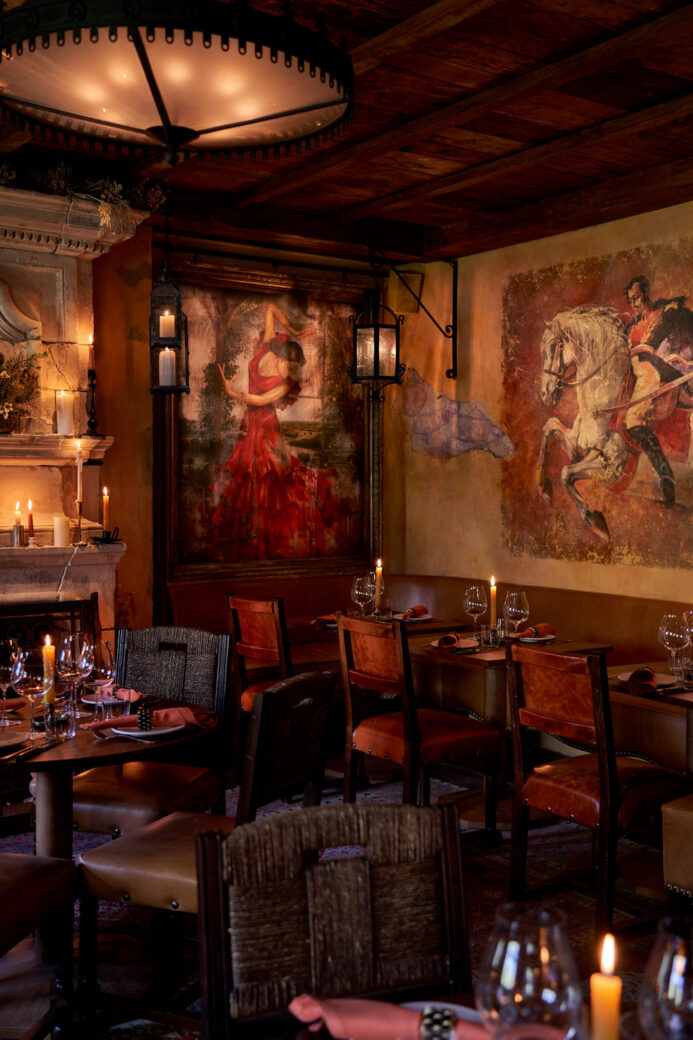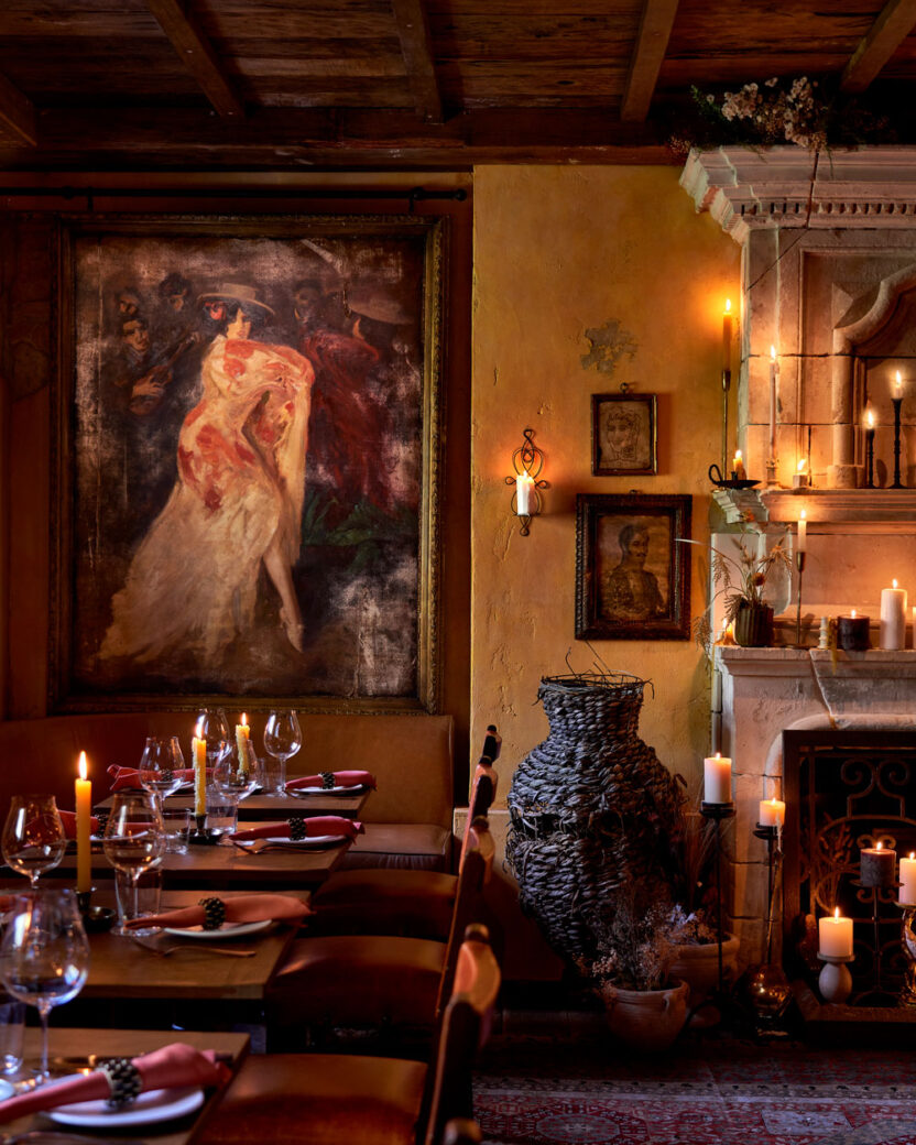 The rustic cantina aesthetic continues with the use of wrought iron in both the bespoke light fixtures and the window frames, paired alongside a traditional stone fireplace lit with an abundance of tall wax candles. To give the space a more authentic vintage feel, the walls have been aged with peeling plasterwork and painted in a faded yellow hue, exposing what would be the original brick and stone throughout the interior. Fettle also reclaimed exposed timber planks for the ceiling, and even distressed the leather upholstery on the dining and bar chairs. The cosy, 75 sqm space therefore welcomes guests with a rich, earthy palette and warm, ambient lighting, in a purposeful contrast from the bright, opulent interiors of Annabel’s (designed by Martin Brudnizki) so that diners feel immediately transported to a different time and place.