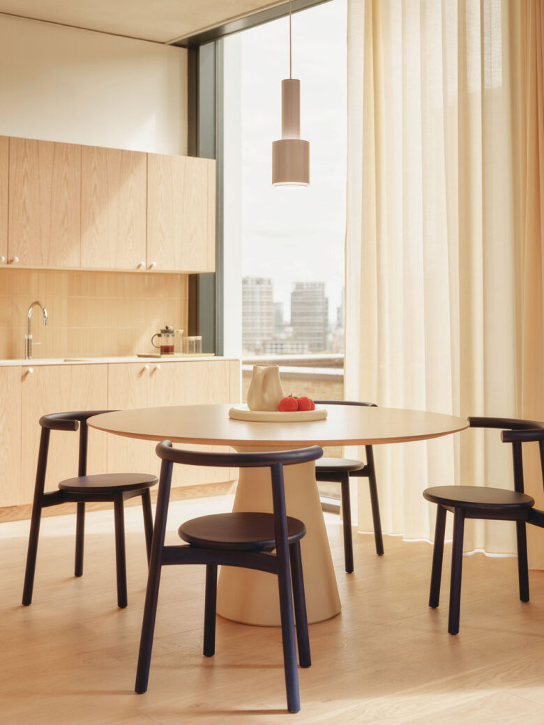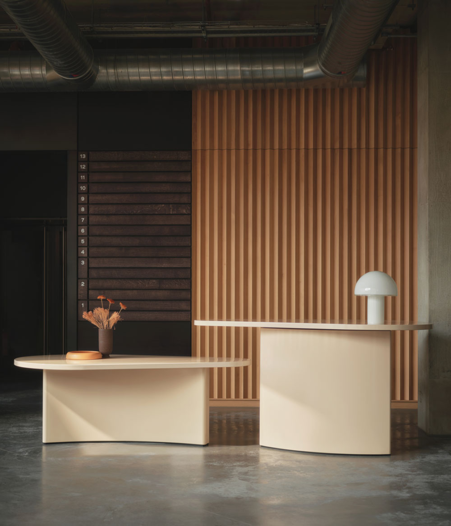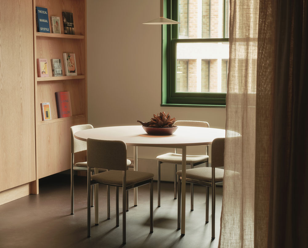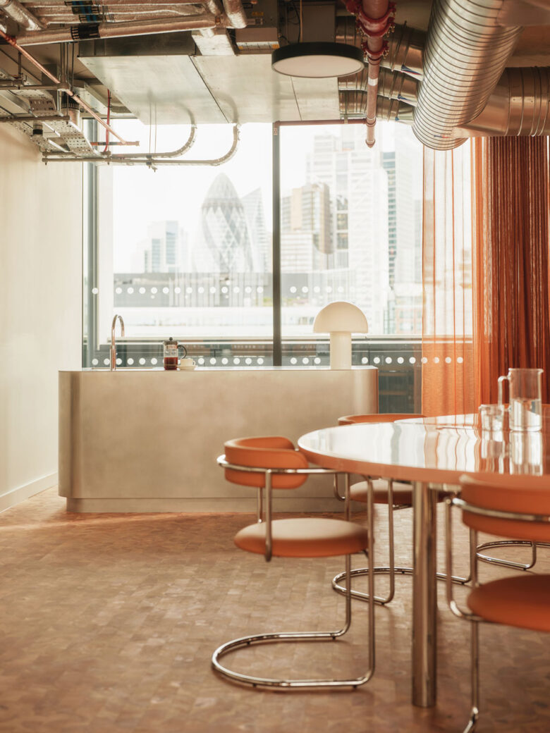 Taking inspiration from the glass merchants that occupied the warehouses in 1875 (as well as art deco showrooms with their enamelled appliances and Vitrolite splashbacks), Universal worked closely with prestigious Isle of Wight enamellers AJ Wells to create more custom meeting tables. “Utilising AJ Wells’s specialist knowledge of enamel and manufacturing, we revisited and perfected these glossy, hand-mixed colour finishes to produce exceptionally crafted tables with unexpected detailing, such as cork lining on the underside of each table for maximum user comfort,” Sweeney tells us. The largest and most impressive of these tables sits on the top floor meeting room of the Nicholls & Clarke building and is inspired by the urban grain of Spitalfields. Consisting of irregular shaped pieces, the conjoined elements create one large meeting table in a warm peach tone, inspired by the unique way that sunlight filters into the space.