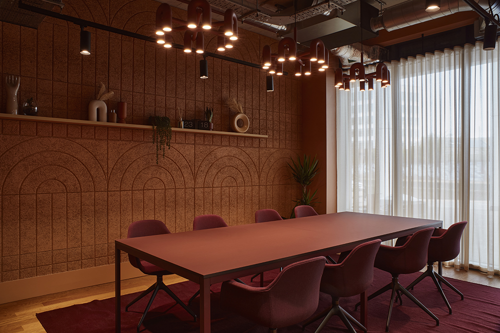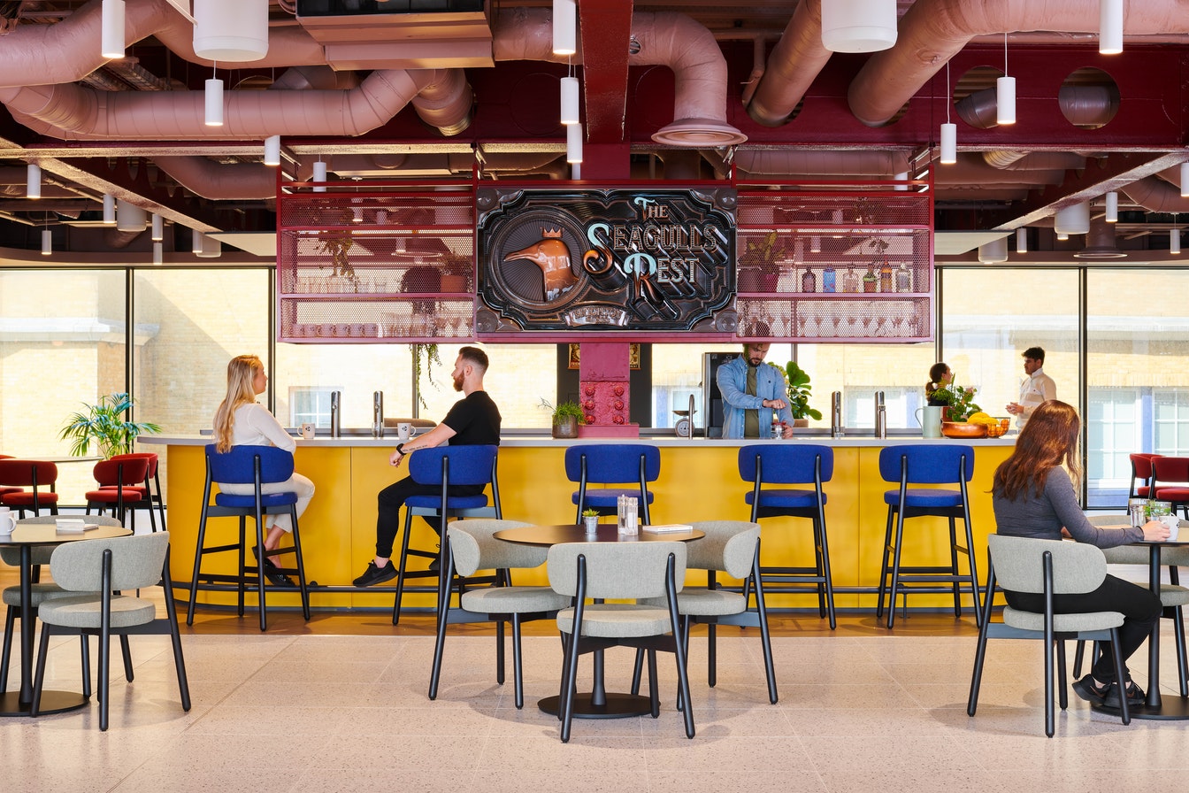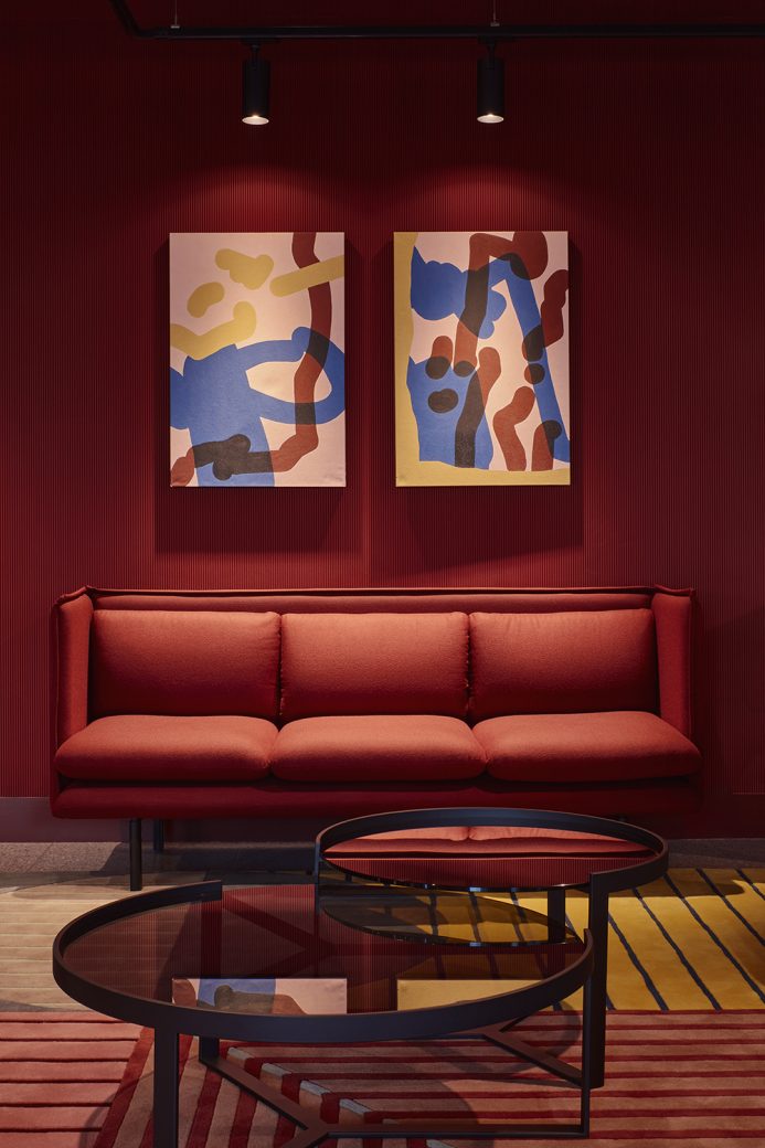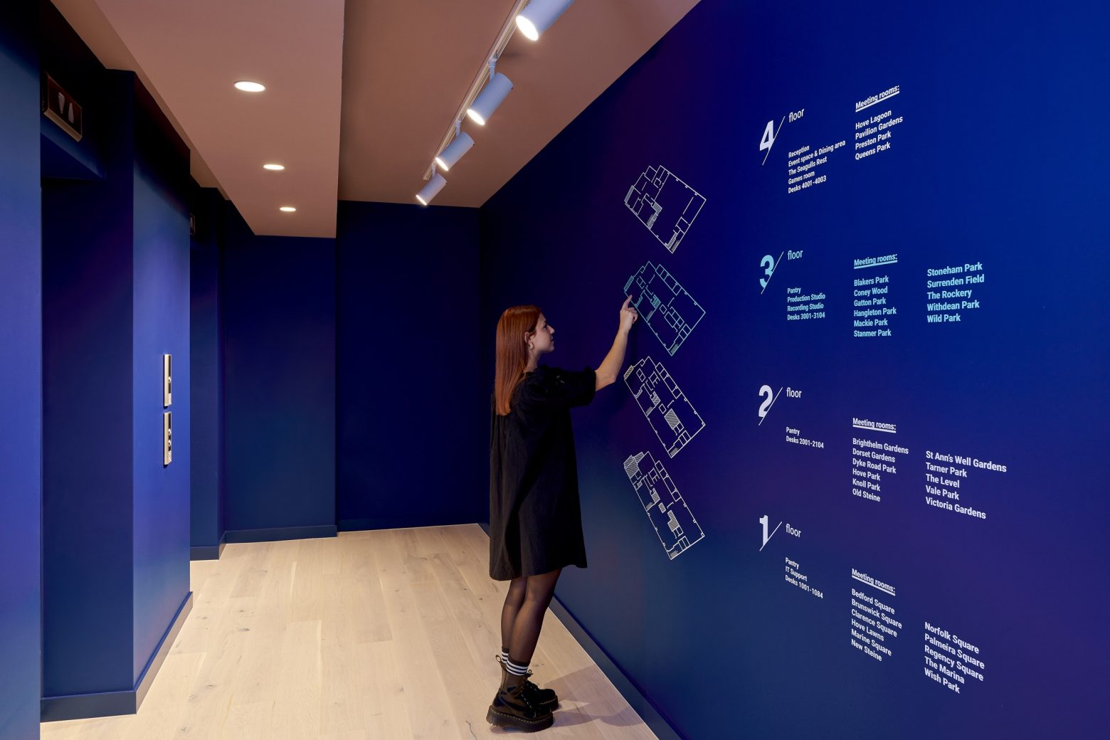 On the ground floor, cool blues set the mood with rich wine tones creating comfortable lounge zones – accented by pops of yellow and green. Textural elements give depth to the scheme – from plush upholstery to acoustic panels – creating a tactile and homely experience.