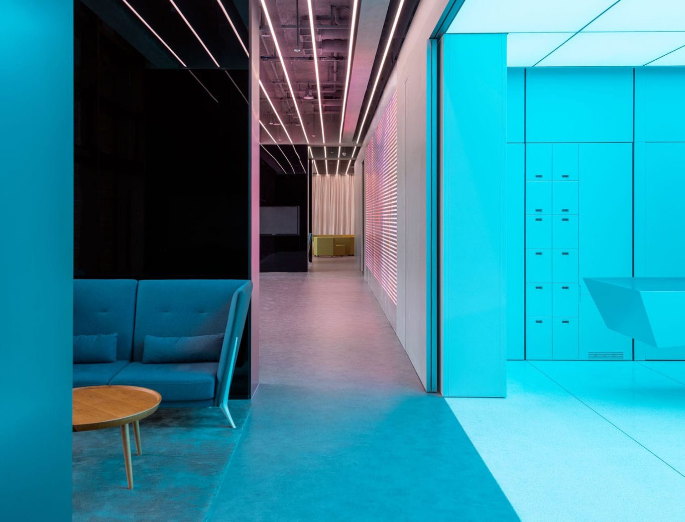 For this innovation centre in China, AIM Architecture has created a flexible workspace through a variety of adaptable furniture and strong colour-blocking. Different spaces are organised by colour codes, creating a varied experience as employees and guests move through the relatively compact space. Bright linear lighting sits neatly within acoustic panels that flow throughout, and, at the entrance, visitors are greeted by a large interactive screen that adds further spectacular colour to the scheme.