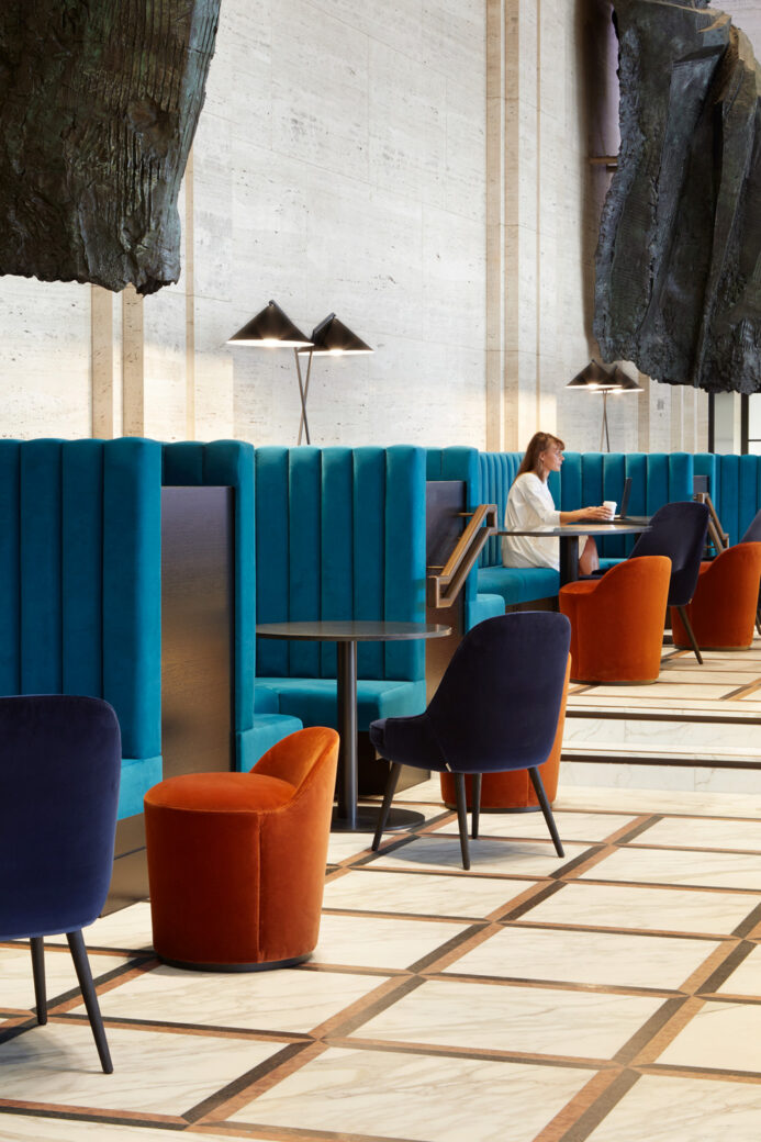 Existing volumes found in the wider refurbishment of the building led to a likeness to theatre design, with tall spaces featuring draping fabrics, soft divisions and dramatic lighting. Fletcher Priest’s interior design team extended this theatrical narrative to the design approach for Storey: the Foyer opens onto the Theatre, an impactful double-height public-facing space animated by an illuminated mesh curtain suspended from the soffit, highlighting the black sculptural piano-like structure which forms the coffee bar below. The concept of ‘front-of-house’ and ‘backstage’ lends itself well to Storey’s shared spaces, with material and lighting choices including exposed bulbs, layered curtains and reflective surfaces characterising the communal areas.