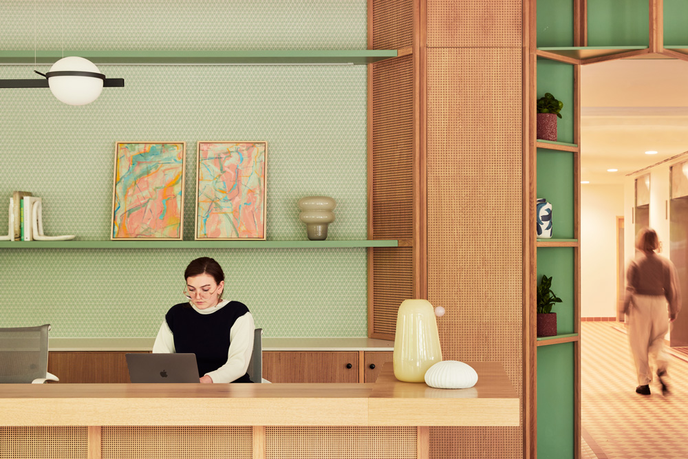 The triangular form of custom wooden shelving is a motif featured throughout the space, notably on the tessellating triangle tiling found on the floors, which shift in shade from floor to floor – with both colours mirrored in the Garden Room’s terrazzo worktops.