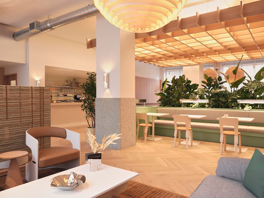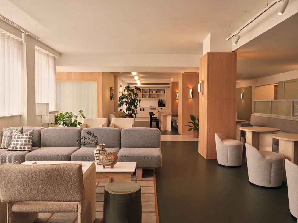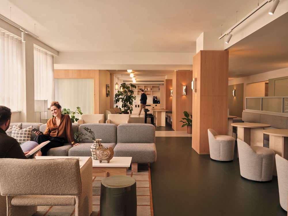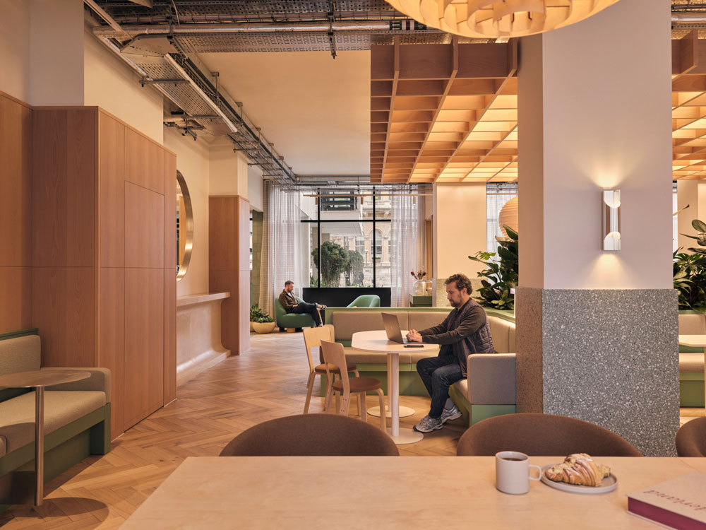 Introducing plenty of natural light and warmth to the Brutalist landmark with new double-glazed windows and interior glazing, Fora also commissioned an array of onsite facilities, including a wellness studio, a café with an outdoor courtyard and a roof terrace with spectacular city views. The flexible workplace provider tapped renowned interior architect Nice Projects to lead the top-to-toe renewal, who started by installing a striking new entrance and restoring the original terrazzo and parquet floors. Achieving a low embodied carbon score, Nice Projects reused existing features where possible to deliver a more energy efficient workspace, while also retaining the building’s character.