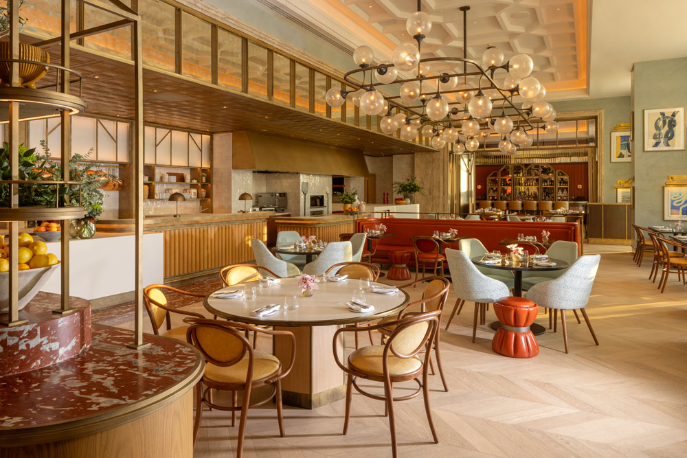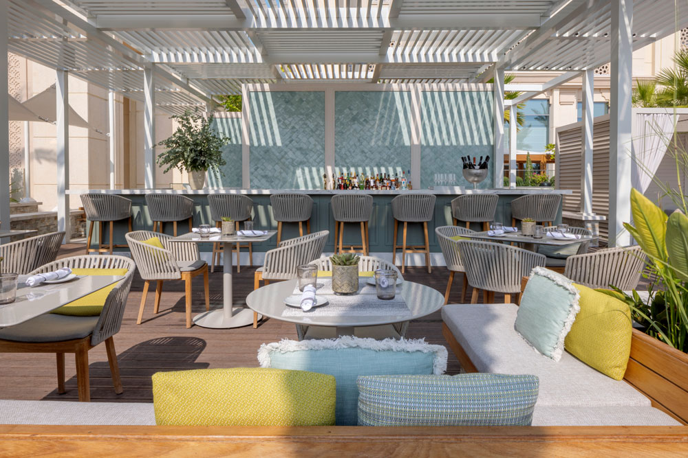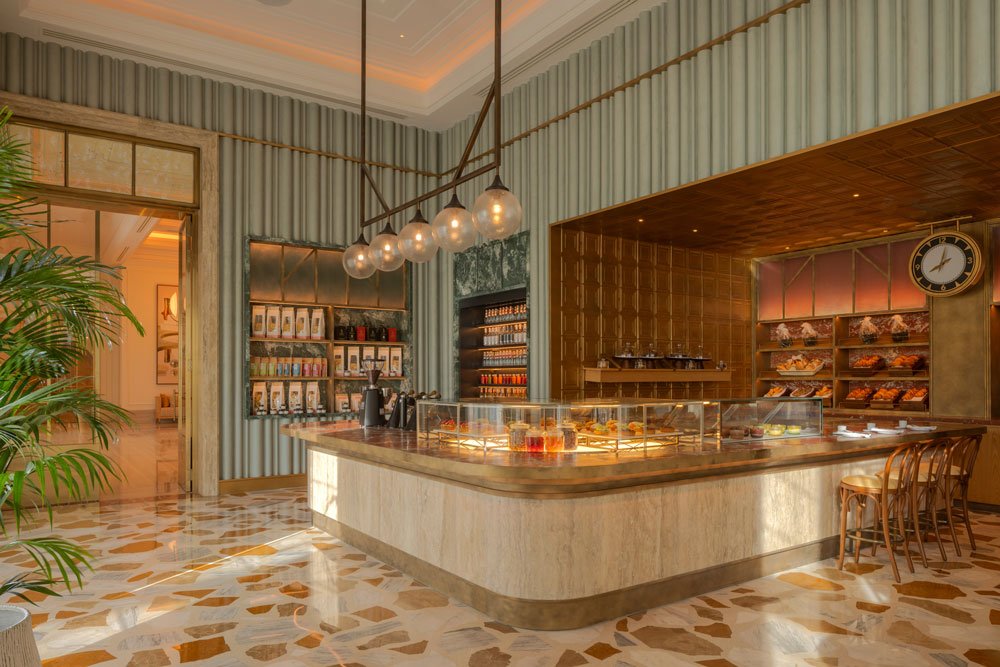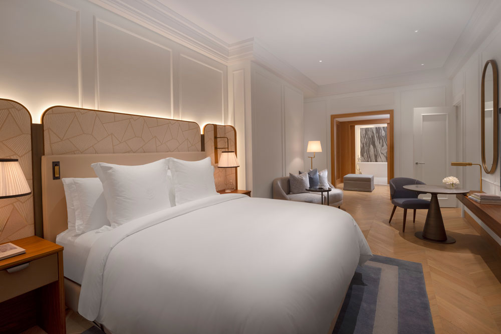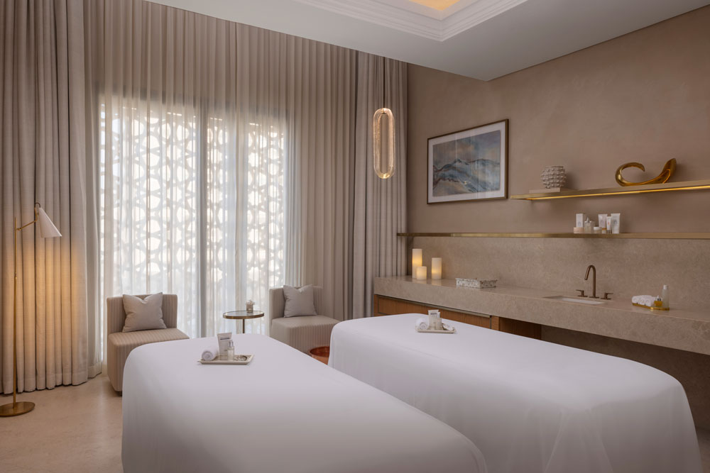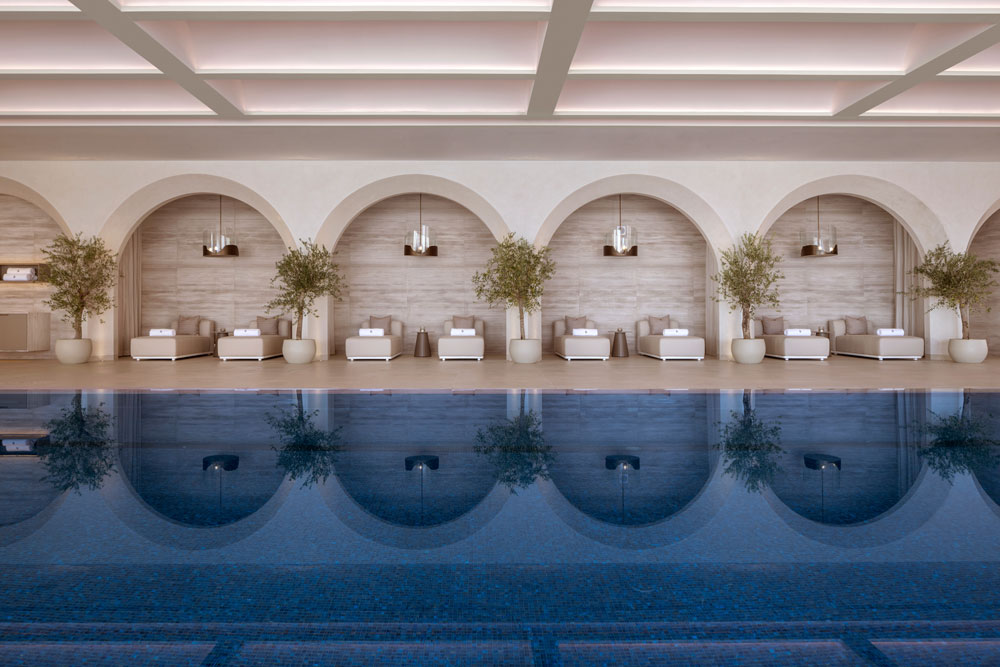 On arrival, guests enter a grand lobby featuring hand-woven wool rugs, bespoke Italian-made furniture and artwork and sculptures made in collaboration with renowned Qatari contemporary artist, Shouq Al-Mana. More European-inspired flair is found in the Italian restaurant, Spuntino, which spills onto sprawling terraces and pools and a secluded beach, featuring walls delicately rippled in a soft green polished plaster finish, giving the effect of sculpted curtains lining the walls. An entire floor has also been dedicated to leisure and wellbeing, with a state-of-the-art spa embellished with intricately patterned marble mosaic walls, plunge pools and a sleek lap pool that sits under a softly lit, coffered ceiling.