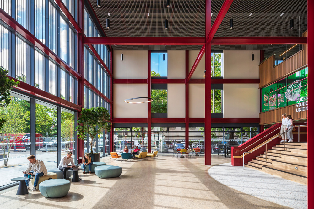 The practice opted not to compete with the imposing Lanyon building and its manicured lawns, but rather to ‘complement’; devising something that would act as a counterpoint both in style and ideology. On the former, it means a vast, multi-storey glass frontage that looks out to Lanyon while, on the latter, an emphasis on today’s cultural and social mores. A large, flexible, full-height foyer is both an arrival area and a forum to meet and relax, bordered by shops and cafes at ground level. A wide social staircase – which doubles as seating – leads users up and into the building, while suspended walkways and mezzanines are peppered with communal tables and chairs.