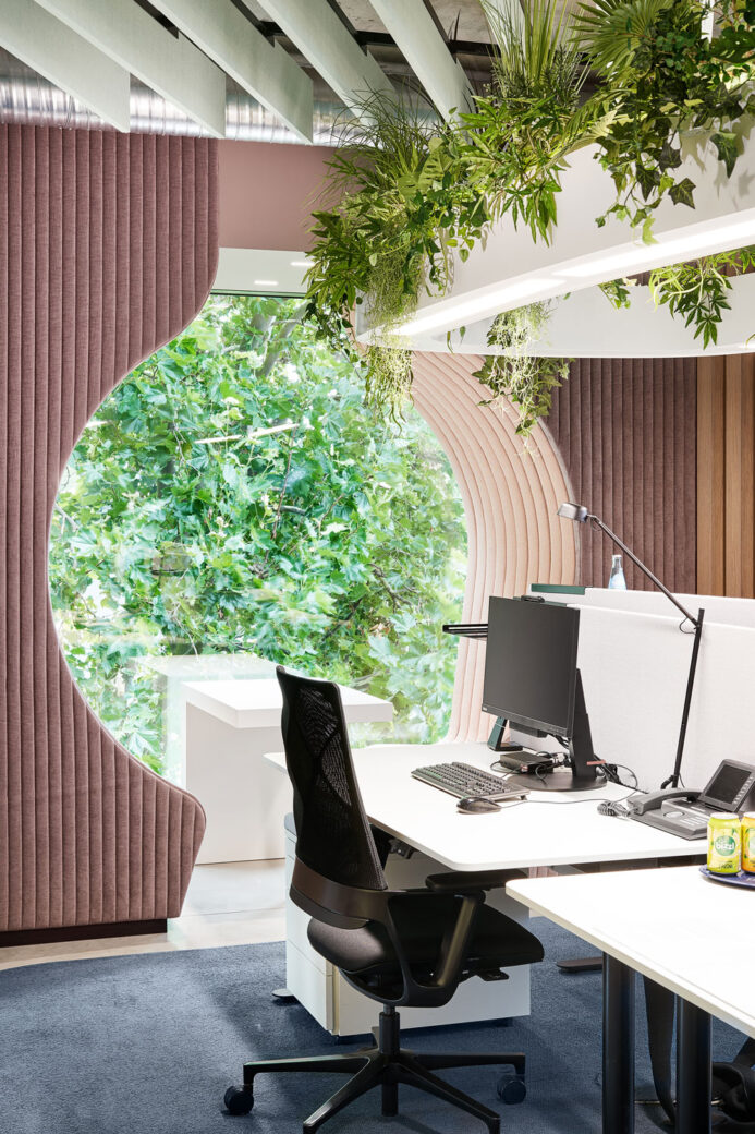 Upper floors feature a room-in-room system, with storage spaces, whiteboards and acoustic panels integrated into the building’s core areas to accommodate a range of different working styles. Perhaps most striking, however, are the circular, plush pink alcoves that extrude through the façade of the building – acting as focused working spots or meeting niches, these window alcoves encourage employees to take in the neighbouring forest as if they are sitting peacefully amidst the treetops.