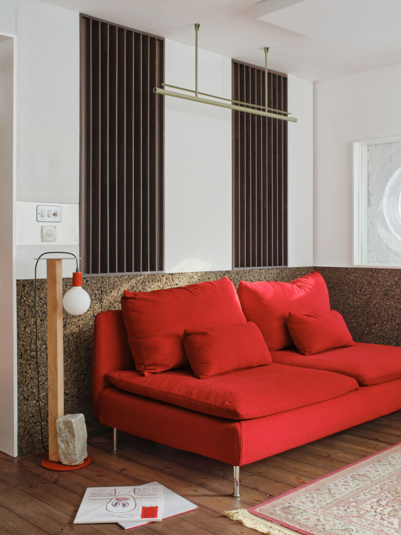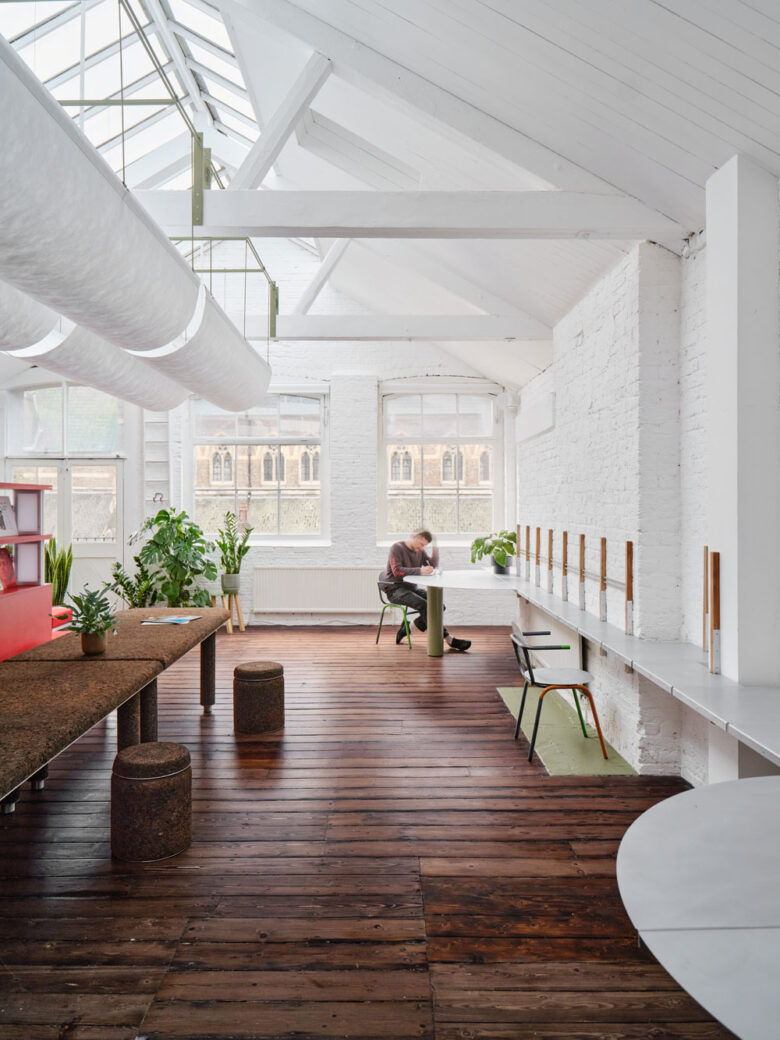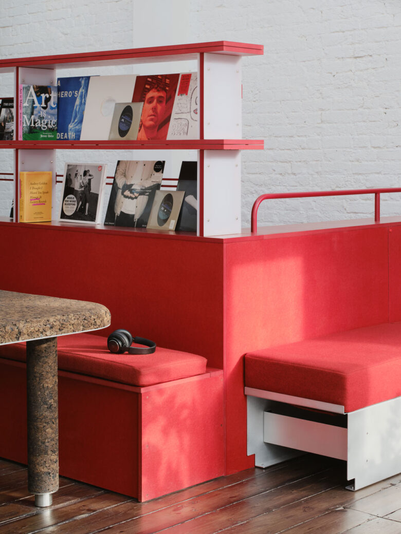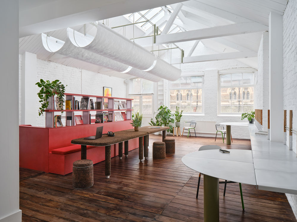 Working closely with Mitre and Mondays, prototypes were developed for custom seating, lighting and shelving units in a tactile palette of cork, aluminium and sycamore (the latter sourced from a felled tree in nearby Euston). Each bespoke piece was then fabricated locally at the Mitre and Mondays workshop in Islington, culminating in a selection of bold, red Valchromat joinery that acts as a unifying element throughout the double-height space.