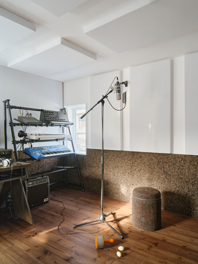 Ascending to the mezzanine, the in-house recording studio features fabric panels, bass traps and Valchromat diffusers for high-quality acoustics. Cork panelling at the base of the room is also backed with sheep’s wool for added acoustic diffusion, while natural light filters in from an internal, circular window overlooking bespoke lighting sails and the coworking space below.