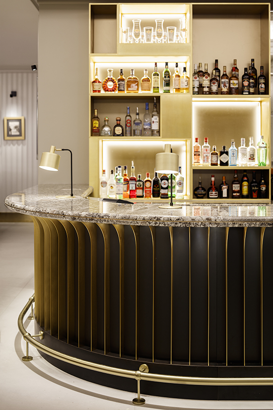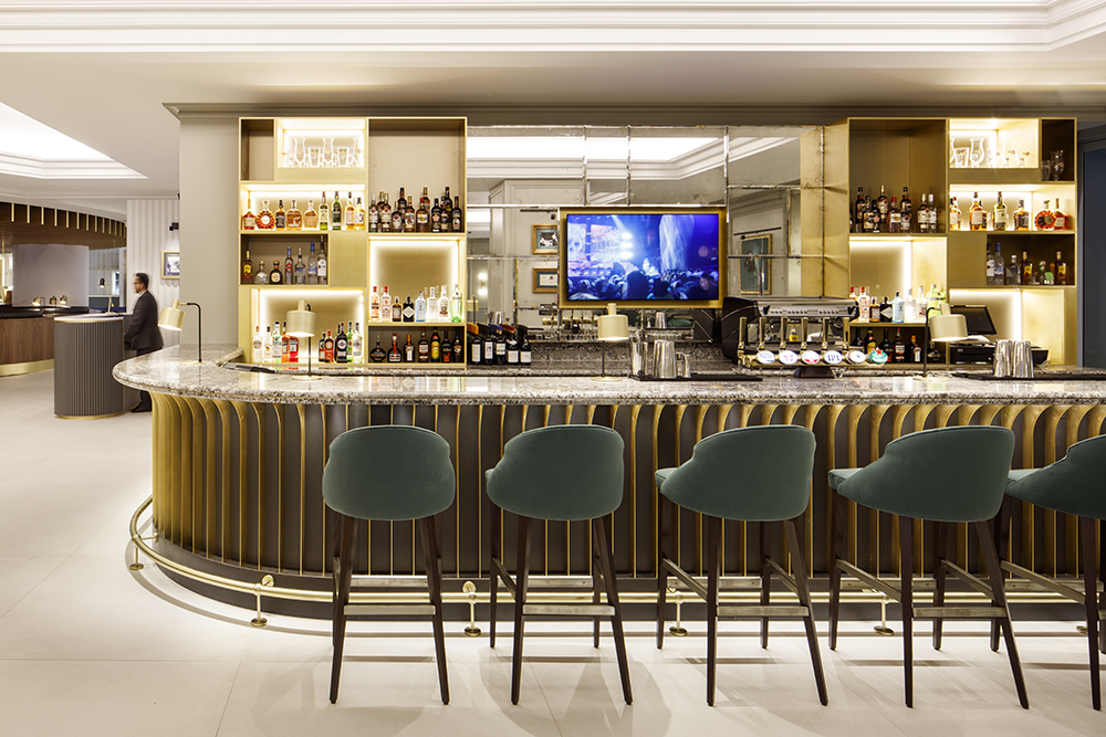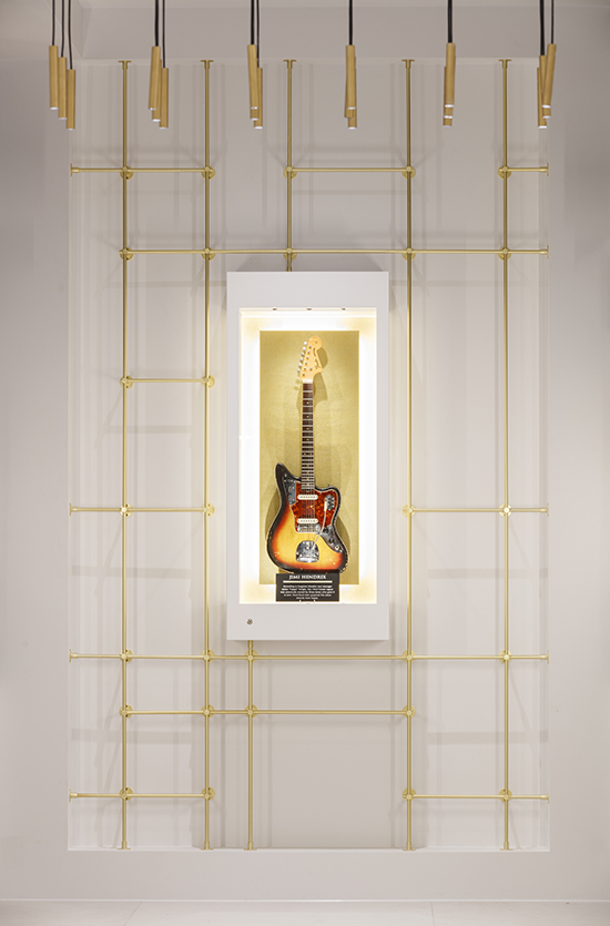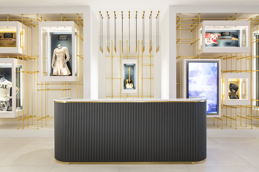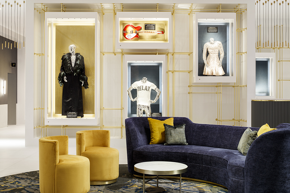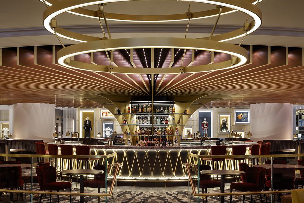 ‘The central bar is actually based on the idea of a master disc dropping into a record player – the kind of record player you might have had at home in the 1970s! We wanted to keep everything open so that, no matter where you’re stood, you can still see the central bar. Then the display cases for the memorabilia are suspended from the walls to create this ‘larger than life’ guitar fret board, which runs along the entirety of the wall here. The entrance itself, with all the mirrors, is a nod to that grand arrival, with all the lights and the cameras flashing.