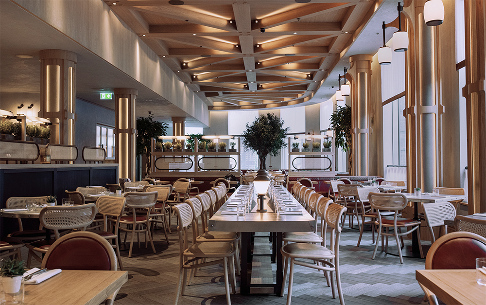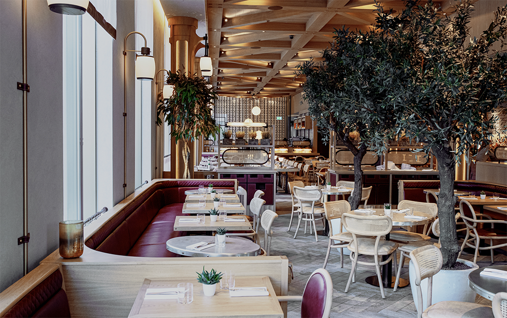 The ground floor restaurant, Barboun, has an ‘industrial-luxe’ aesthetic with rattan chairs and partitions. ‘The Barboun restaurant was conceived as a furniture maker’s warehouse and showroom. Handcrafted from oak and sapele timbers, we paid homage to the craft of the woodworker and so mortise and tenon, dovetail and halving joints are showcased on each piece of furniture or joinery to celebrate each material and junction fully,’ says Steven. The pared back warehouse aesthetic is finished off with an asymmetrical pale oak ceiling, replicating the beamed structure of a factory warehouse. A striking steel re-bar and copper staircase sits towards the back of the space, along with a central feature of moon chandeliers.