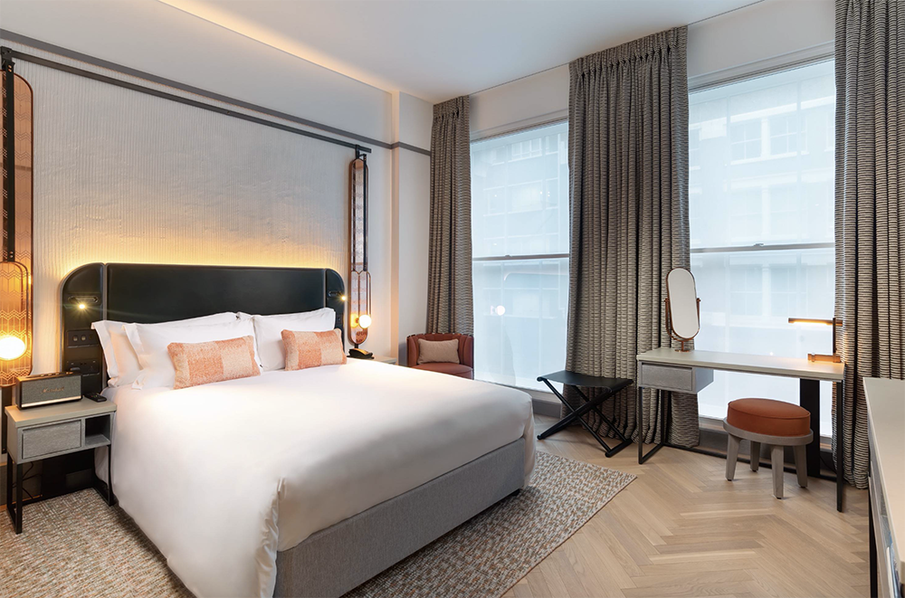 Guests can choose from nine room and suite categories, all of which feature a soft colour palette of white and grey with burnt orange and deep green accents. ‘The materiality of the rooms is a totally new aesthetic; we are not trend-led on our design approach, moreover we let the stories we want to tell shine through and dictate the palette,’ says Steven. Predominantly contemporary in style, with copper mirror detailing and simplistic modern furnishings, the guestrooms are warm and inviting, with subtle design details throughout – such as saddle-stitched leather strapping and copper rendered marmorino textures. Copper leafed bedside mirrors are embossed with woven lace etchings in a nod to the Huguenot history of nearby Spitalfields.
