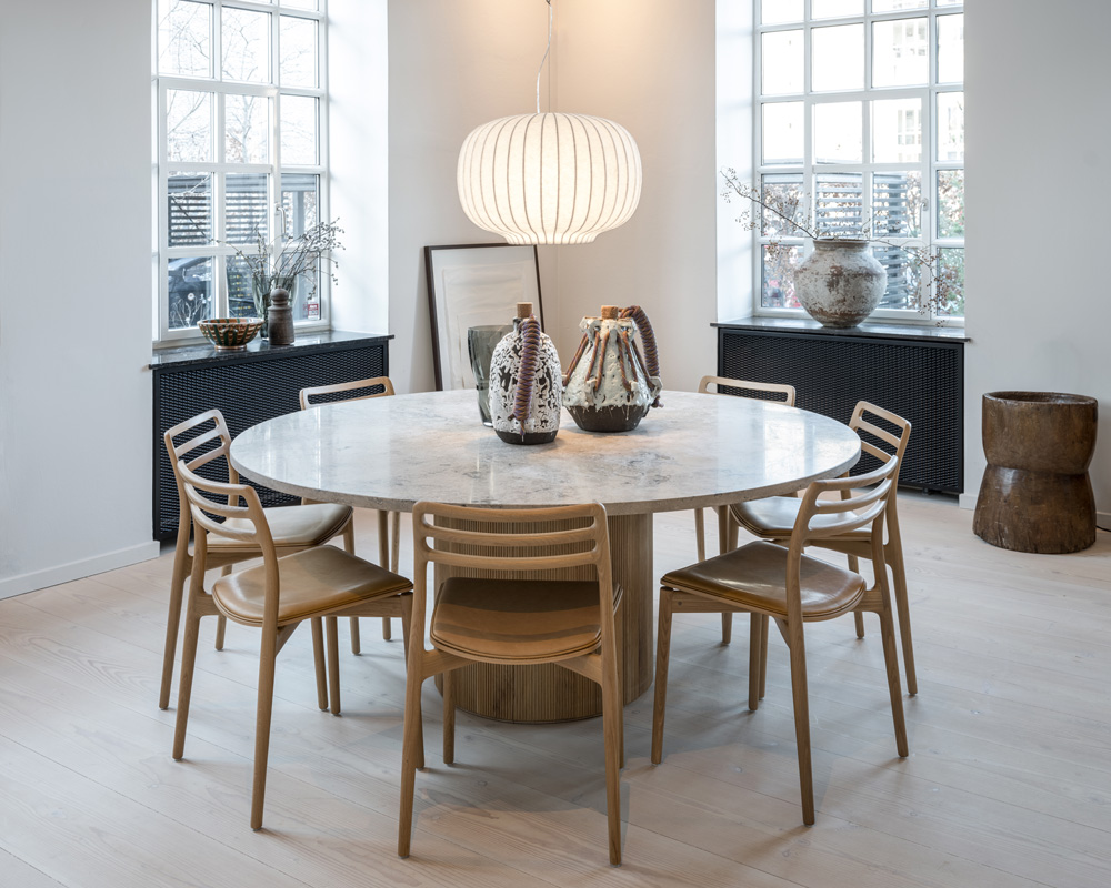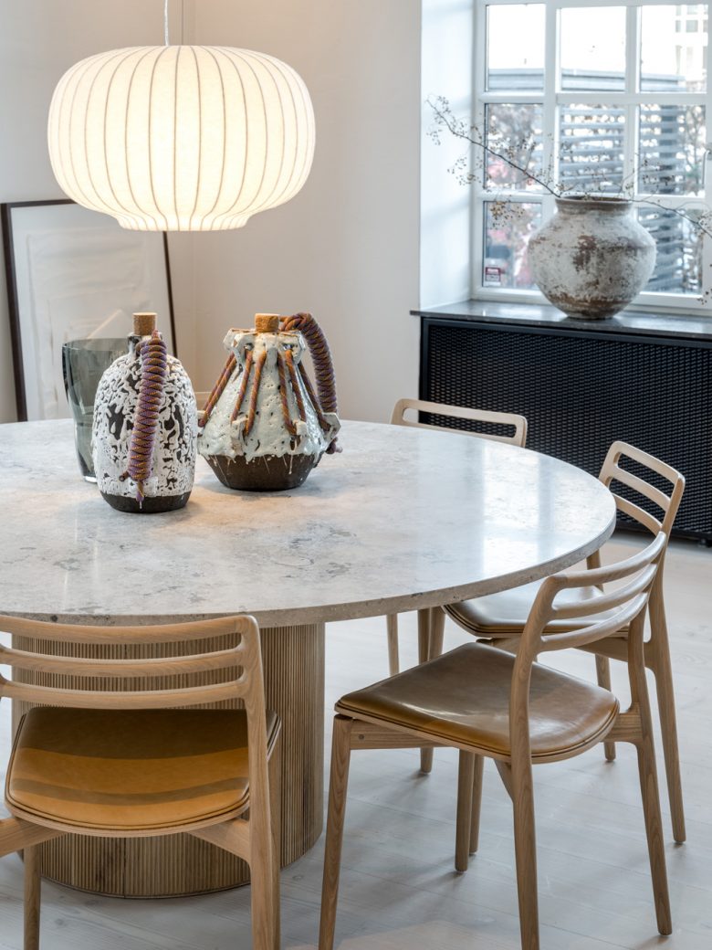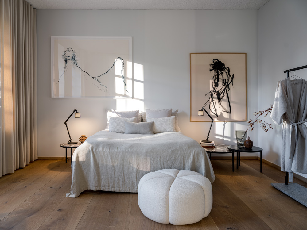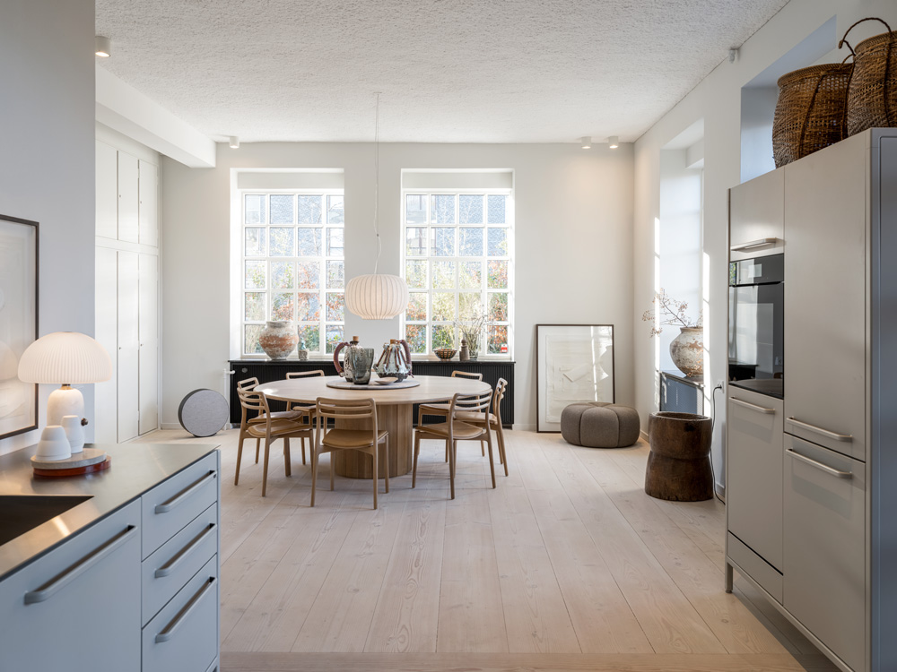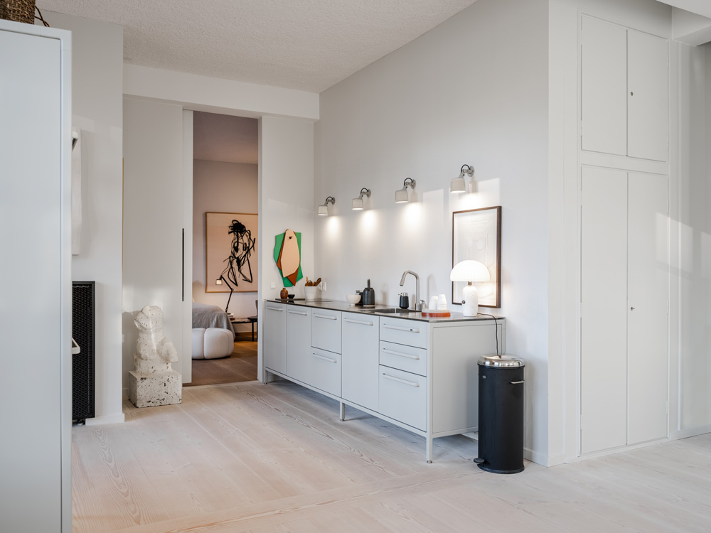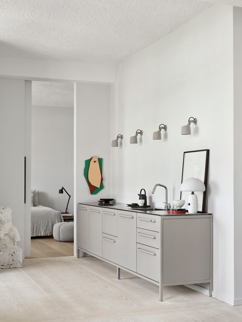 Designed by Julie Moelsgaard, the 90m2 space channels Scandinavian minimalism across a double bedroom, bathroom, open plan kitchen and dining room, whilst tranquil wall art and a plaster sculpture by Cecilie Vår Norsahl add moments of intrigue. Meanwhile, floor-to-ceiling curtains by Kvadrat cover the factory vitrines and complement the palette of natural grey and white.