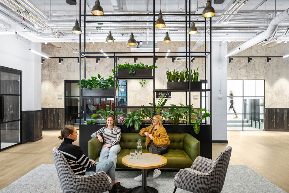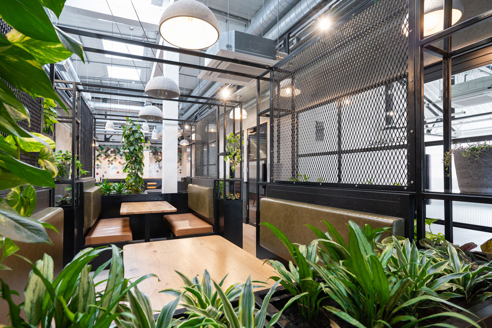 Designed by Frost Architects, the open plan breakout space and tea point forms the centrepiece of the refurbishment, where a blend of heritage and modern design nods to the building’s past. Original Art Deco flooring and exposed brick walls act as a canvas for more contemporary industrial elements like pendant lighting, leather seating and black steel furniture and booths. High-ceilings, white-washed walls and plenty of greenery lift the darker components and add another layer of privacy within the open space. Patterned tiling splash wall was designed to simulate a canopy and these floral accents flow into the reception desk, meeting room, and upstairs to the fourth floor coworking space. The incorporation of plants and floral accents not only adds aesthetic appeal but also promotes wellbeing and biodiversity, say the architects – a key priority for Workspace across its portfolio. Upstairs, a ‘hidden’ roof terrace offers impressive skyline views of London and a further spot for collaboration and socialising.