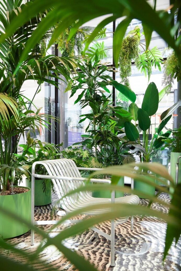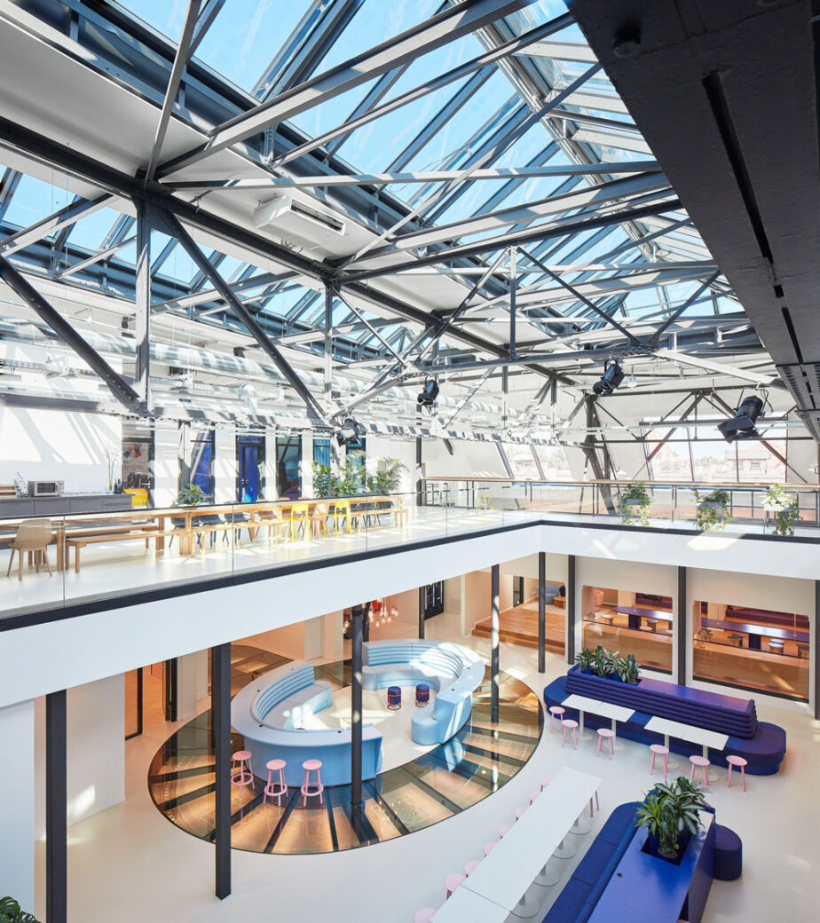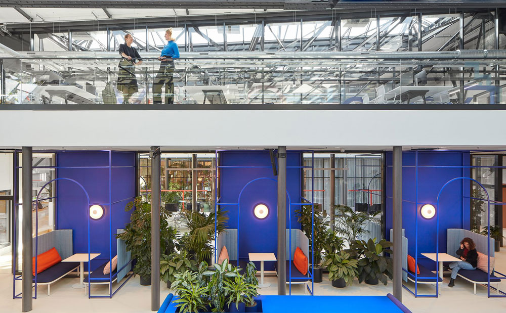 An L-shaped gallery level (constructed by Graft) was incorporated into the redesign, providing the dual function of emphasising the striking high ceilings and maximising the 5,500 sqm footprint available. Underneath this gallery extension, Kinzo conceived three specifically designed ‘retreat rooms’ – each with their own distinctive, playful theme – to recognise the growing importance of social spaces in the modern workplace. Here, staff have the choice of a stylised ‘pool room’, fully planted jungle room or a plush disco room where they can hold social events, share a coffee break with a colleague or simply take a moment alone.