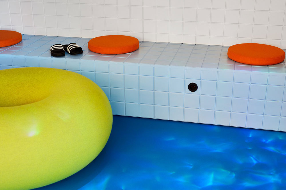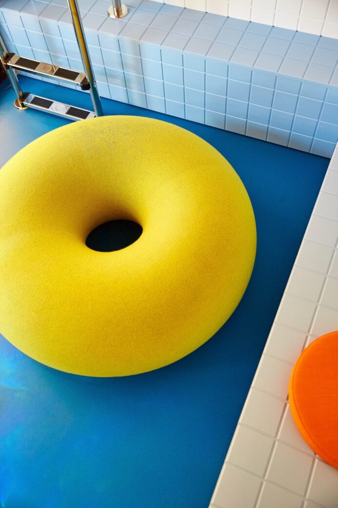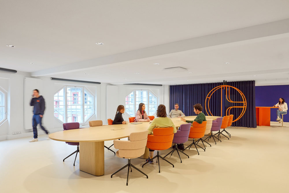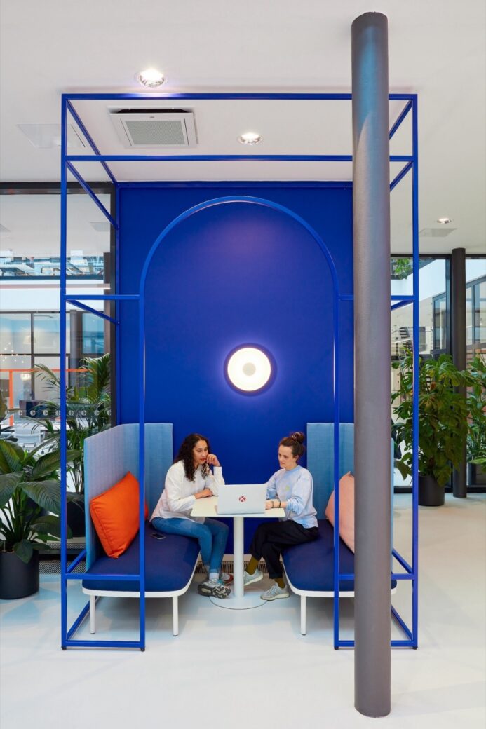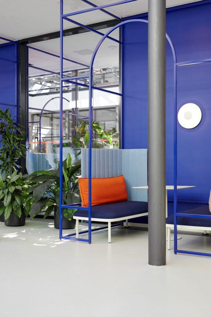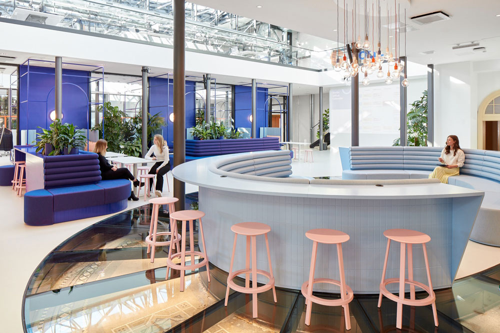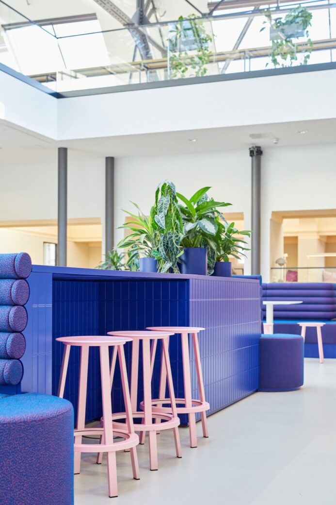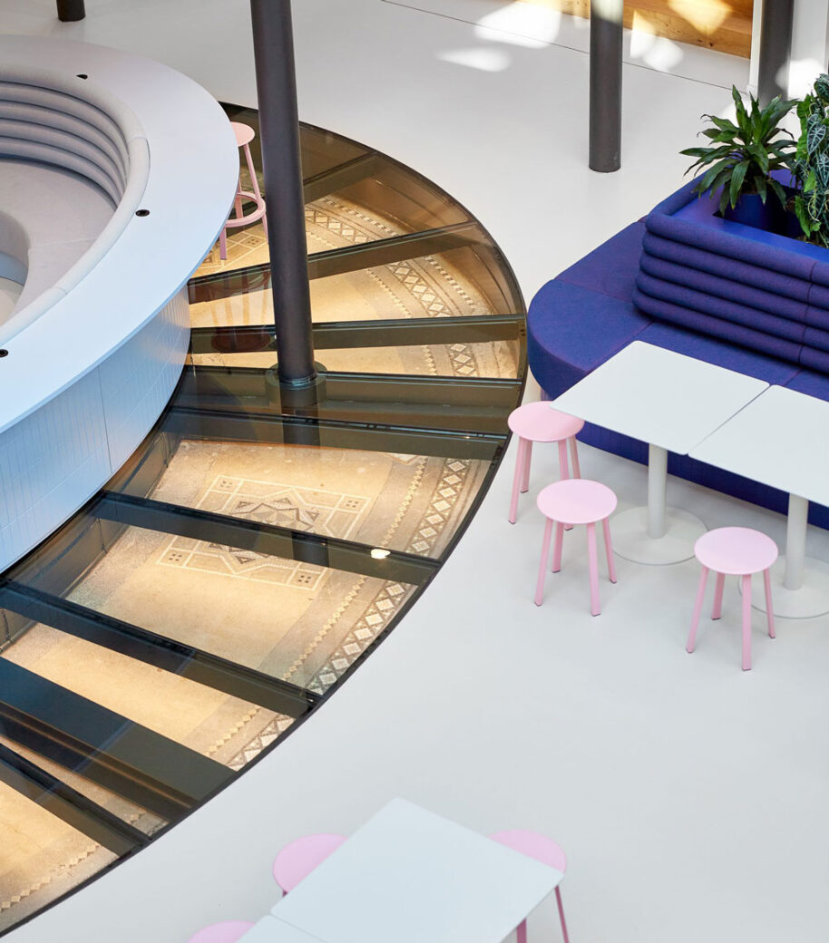 Admiralspalast’s Art Nouveau character and its function as a former bath house acted as guiding principles for Kinzo’s design concept, influencing everything from the floor plan to staging and reinterpreting historical artefacts or fixtures. For instance, sections of the original ceramic- and mosaic-tiled floor are displayed in circular glass cases surrounding the new reception desk, giving visitors and office tenants a glimpse of the building’s storied past amongst all the colourful, modern additions to the space.