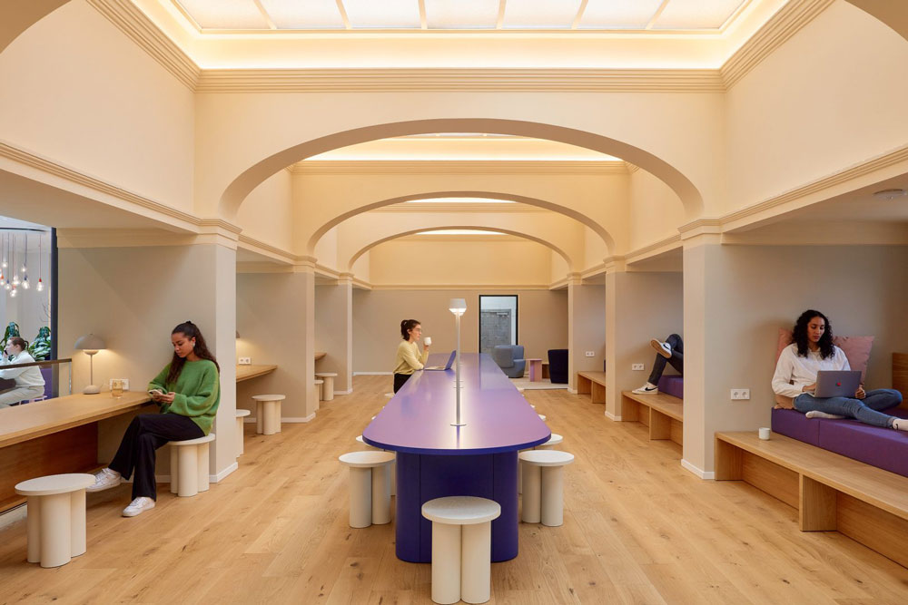 Benches where bathers once met to relax and converse on contemporary issues have also been updated and transformed into a dedicated library-like space, ideal for quiet focus or small group work. Retaining the arched ceilings synonymous with Roman-style baths, these customised retreat niches are also joined by an eight-metre-long community table and individual counter workstations, allowing staff the flexibility of coworking and collaboration as well as focused work when needed.