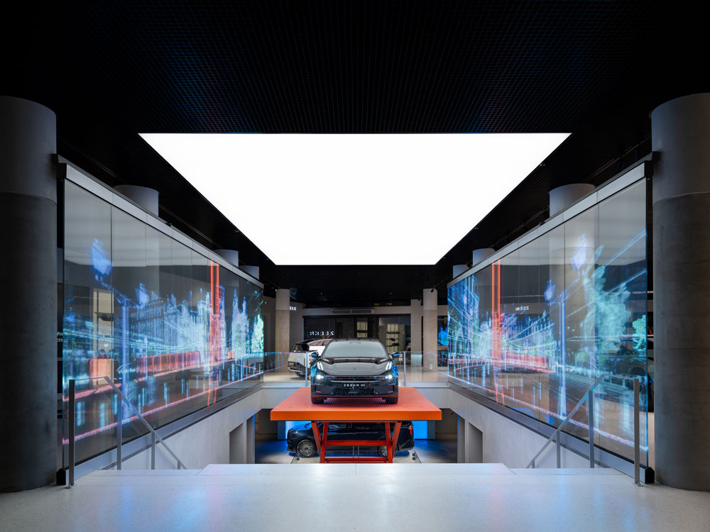 Capitalising on its prime location at the intersection of Rokin and Kalverstraat – the main canal and shopping artery of Amsterdam – the studio incorporated two glazed frontages, allowing the store to be seen by passing pedestrians, cyclists and even boats from both sides. Venturing inside, visitors are presented with an audiovisual installation called ‘The Central Moment’, which is centred around a bright orange car lift. Occupying a gulf left by the department store’s old escalator, this flexible lift platform displays a sleek Zeekr car, around which installations can be created and updated by the store. Enabled by vast transparent LED screens (used at this scale for the first time outside China), these installations were created in partnership with BAFTA award-winning creative studio Factory Fifteen. In this dramatic focal point, the transparent screens allow the visuals to be seen from all sides reflected on the body of the car, simulating a test drive in imaginary European cityscapes or lush countryside scenes.