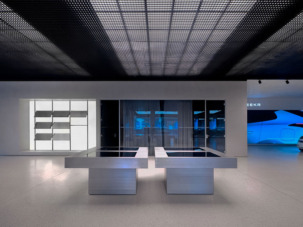 Alongside bespoke stainless steel display systems and modular configuration tables with embedded tech, Unknown Works also relied on light to play a crucial role in customer experience. Against a minimalist backdrop of white terrazzo and exposed concrete columns, all lighting systems are colour customisable, allowing staff to transform the space depending on the occasion – throughout the store, a grid of light panels are also set above an open mesh ceiling provide additional depth to the tall space. “We aimed to maintain transparency across the space, ensuring that the product and story of technology is championed,” explains Kaowen Ho, Director of Unknown Works. “Something visible from both the shopping district and canal-side context, and capable of capturing people’s attention from outside and drawing them in.”