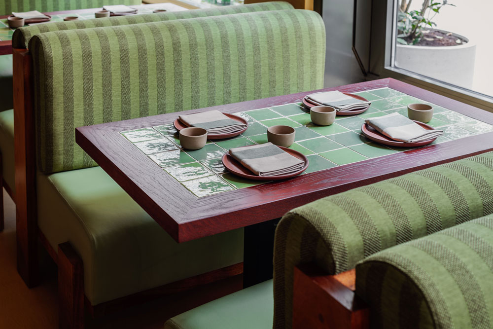 Presented with an L-shaped, open-plan layout, A-nrd zoned the 450sqm space to create more distinctive, intimate dining areas. Entering from the bustling Heddon Street, guests enter through amber Kansa glass and are welcomed into a world of craft and colour by a custom welcome desk and abundant indoor planting. Window-side dining is provided by a custom oval shaped table – crafted from black-stained oak inlaid with grey micro cement – and bespoke accent chairs made by a local artisan, which are upholstered in a blue graphic weave by Tibor. Warm, ambient lighting emits from large, organic pendants by Lucia Ocejo at Crown Works Pottery, reflected by glossy Solus tiles in a terracotta hue (a motif that appears on both the walls and across the bespoke dining tables throughout).