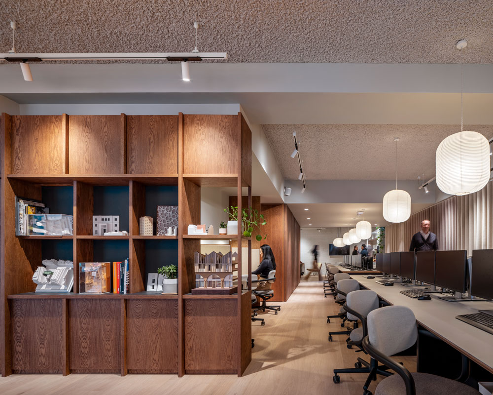 The street facing studio looks out to the buzzing Charlotte Street, presenting as a showroom of architectural product and process. Noticing that showroom space is more affordable than traditional offices, dMFK saw the opportunity to transform the space into an agile, high quality and flexible workspace. Wherever possible, quality aspects of the previous fit-out have been retained or repurposed, including a beautiful solid French oak floor, rusty Corten steel wall panels and doors and parts of the air handling system which has been significantly upgraded to provide superb internal air quality.