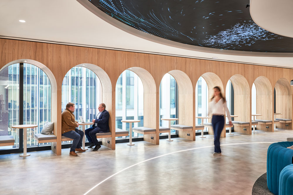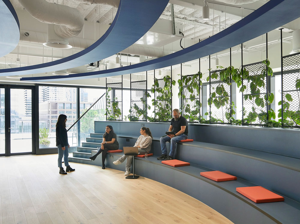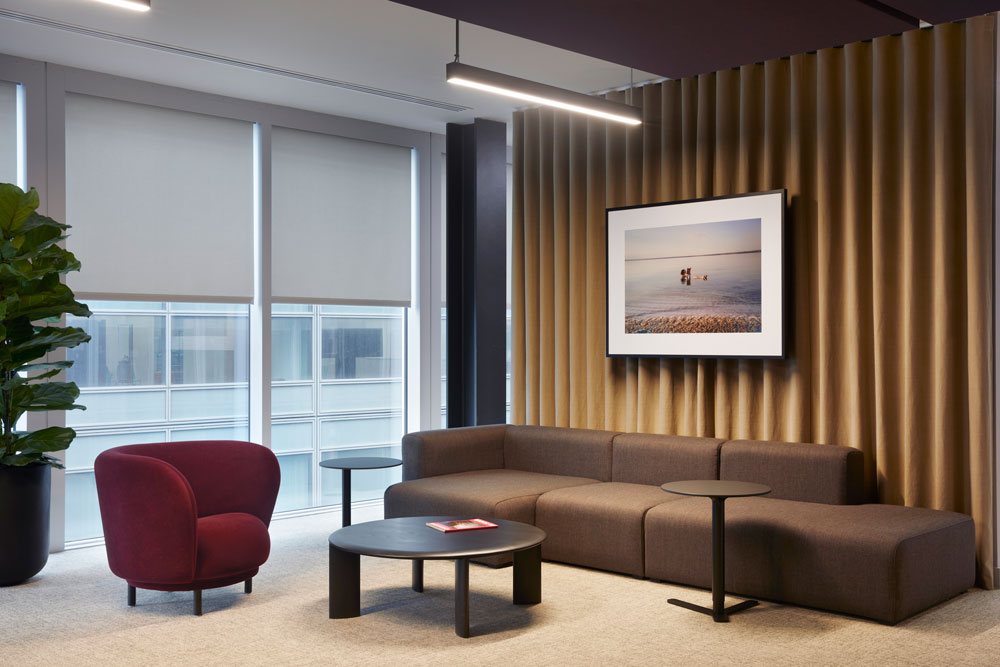 The 12th floor HQ – located on the waterfront at Canary Wharf – revolves around circular economy principles defined in a robust sustainability strategy by tp bennett, with a strong focus on minimising embodied and operational carbon throughout all design aspects. These efforts extend to the building’s water and waste management, as well as the use of biophilia and furniture, which is made up of 80% reused existing materials.