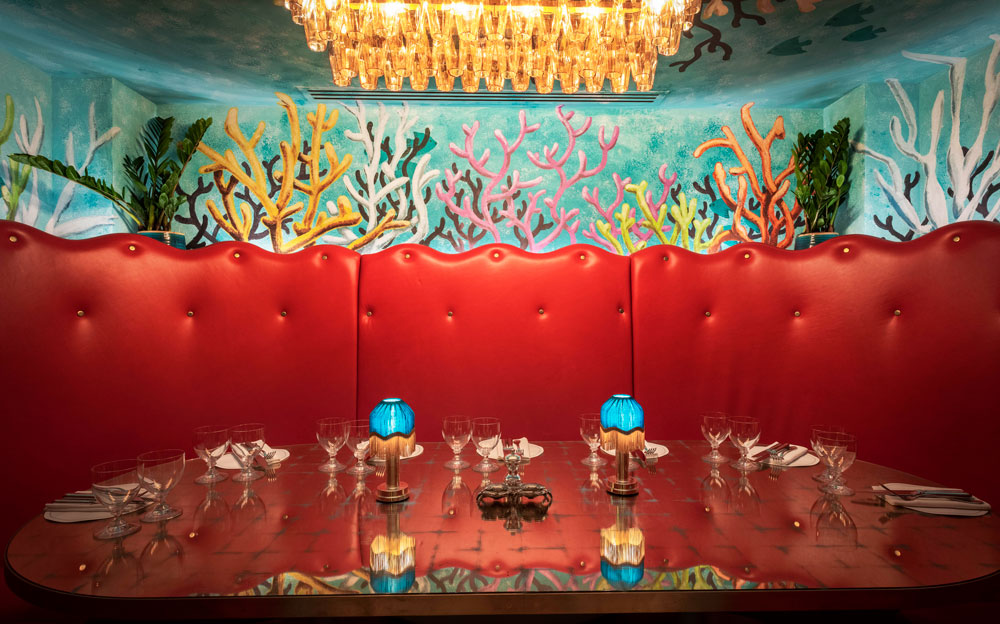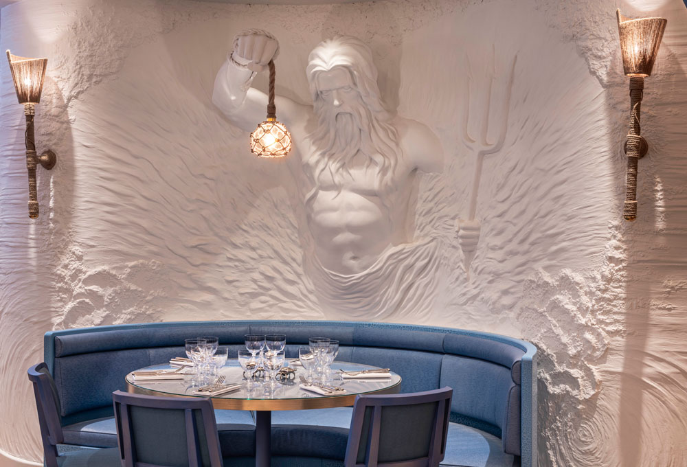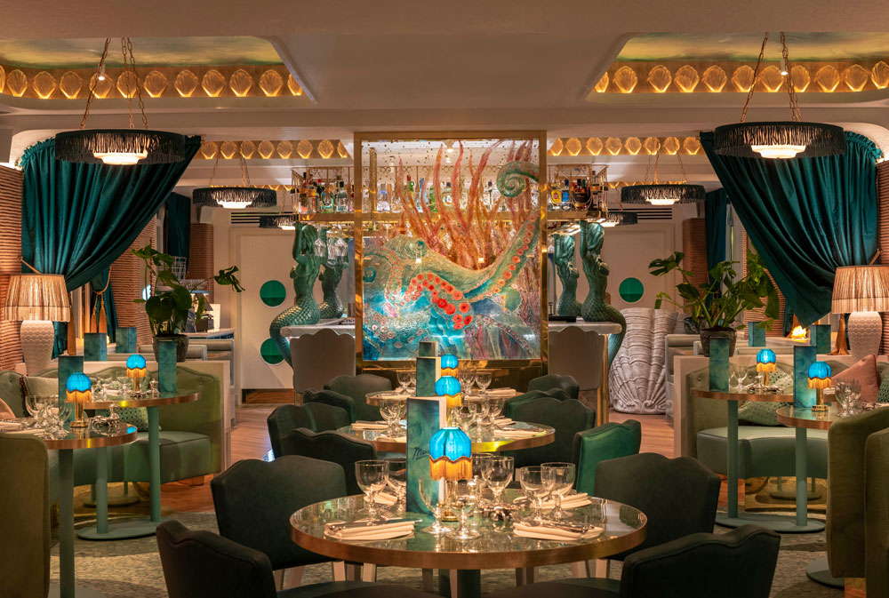 Granted free creative rein by Wolseley Group, the studio first sought to root the 240-cover restaurant in its surroundings, and provide a response to them. In the first floor dining room, a sculptural Poseidon towers over a table, clasping a swaying light fixture in one hand, his trident in the other. Venture to the even more grandiose space upstairs, and vaguely life-size mermaids prop up the bar, conger eels snake around wall lamps and a gallant glass centrepiece depicts an enormous octopus in teal and shades of red.
