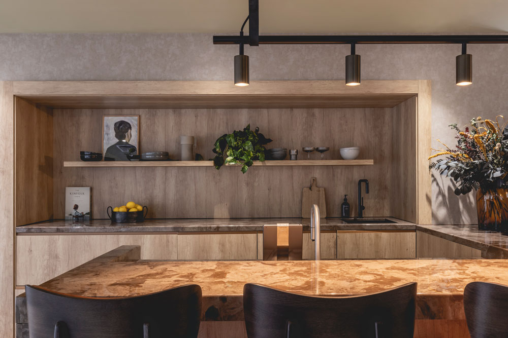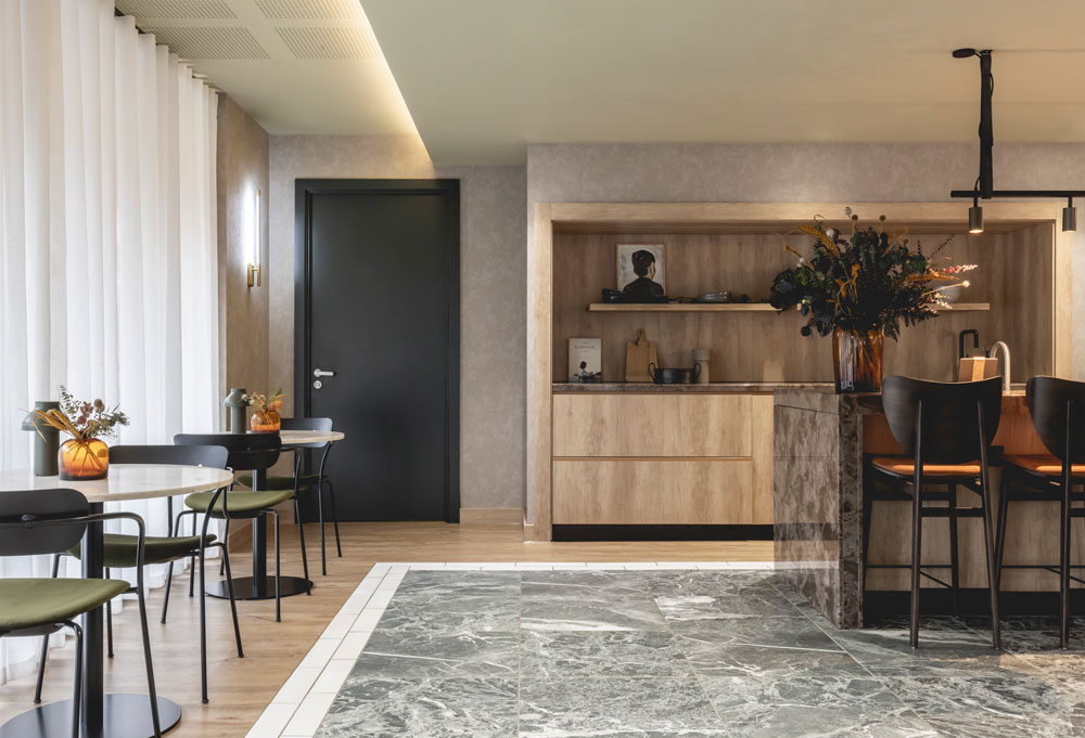 Nodding to the lifestyles of both overseas and local residents, a base palette of greens is inspired by the East-Asian matcha latte; popular for its healthy but comforting connotations. A marbled floor tile simulates the stirring of milk into the smooth hot drink and the ceiling is painted a cool shade of matcha green. Bespoke honey-toned timber furniture is used throughout for its stabilising effect and complemented by a brown textured wallpaper to create warmth. Intentional clashes of yellow or black are introduced to imply that nothing is ‘too perfect’ and to instil nuances of “bravery and playfulness,” says Rousell. “As designers, we’re curating environments that arouse a feeling from the user. When you come in here, you’re subconsciously deciding how long to stay, how to behave and how comfortable you feel. The objective is to bring the people who live here together in a way that feels natural.”