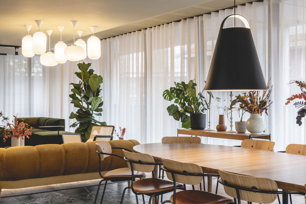 For a relatively small space, it works hard. The lounge, while open-plan, is divided into designated areas: a flexible space features modular green, velvet sofas – soft to the touch to encourage physical interaction – and small black tables that can be arranged to create formal lounge seating or moved around for impromptu movie nights hosted on a pull-down projector screen; a bar is provided for making hot drinks or for preparing food which can be served at the large shared bar table; and a coworking zone operates during the day, providing an extension to the home for young employees working away from the office.