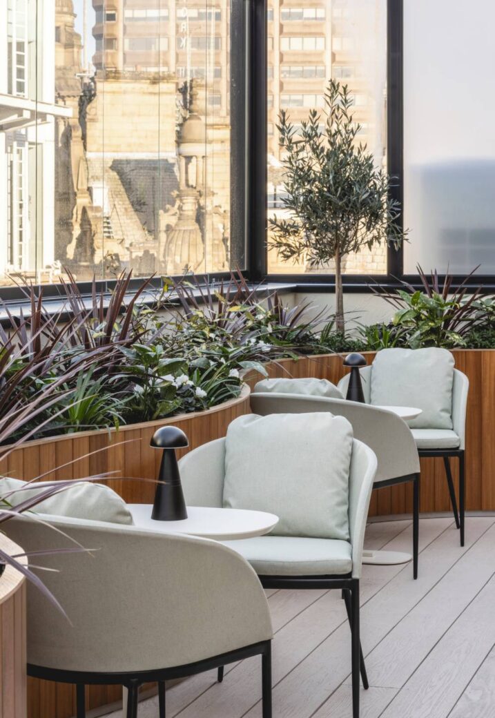 As maximising the potential of the existing space was also a priority, JOLIE repurposed a redundant plant room on the sixth floor into a covered loft extension. Here, tenants can work and relax from sunrise to sunset, be they hosting informal meetings or attending exclusive events. Usable all year round, this space can also act as an outdoor cinema during the summer months, with combined lounge and bar amenities that offer everything from morning coffees to evening cocktails.