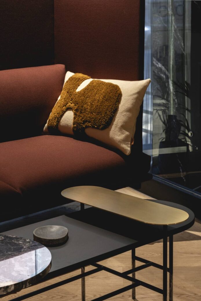 Often an overlooked sense in interior design, 60 Fountain Street pays close attention to sound. In the reception and stairwell areas – which feature dark textured marble-effect walls and rich-toned upholstery and paint – an uplifting soundtrack inspired by Maribou State has been curated. In the loft space, an ethereal and cinematic soundscape plays, reinforcing its role as a welcoming co-working zone.