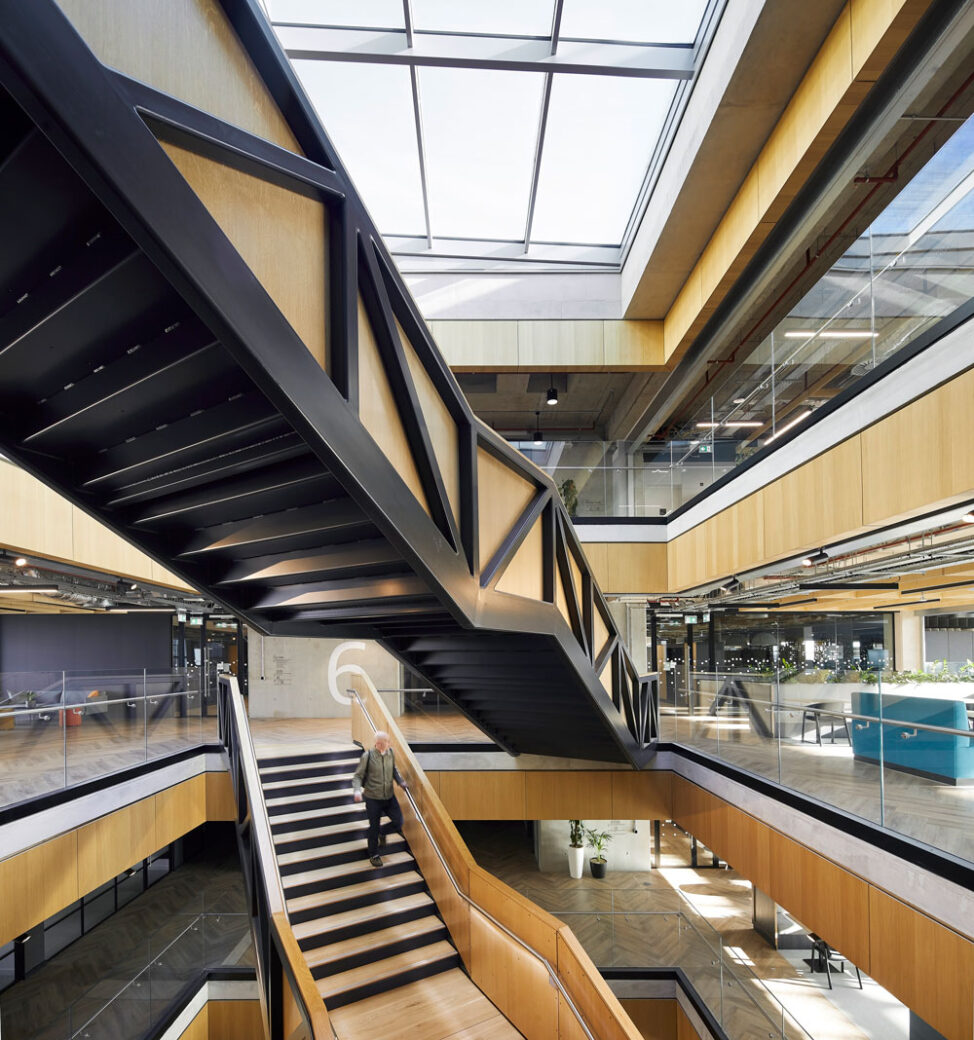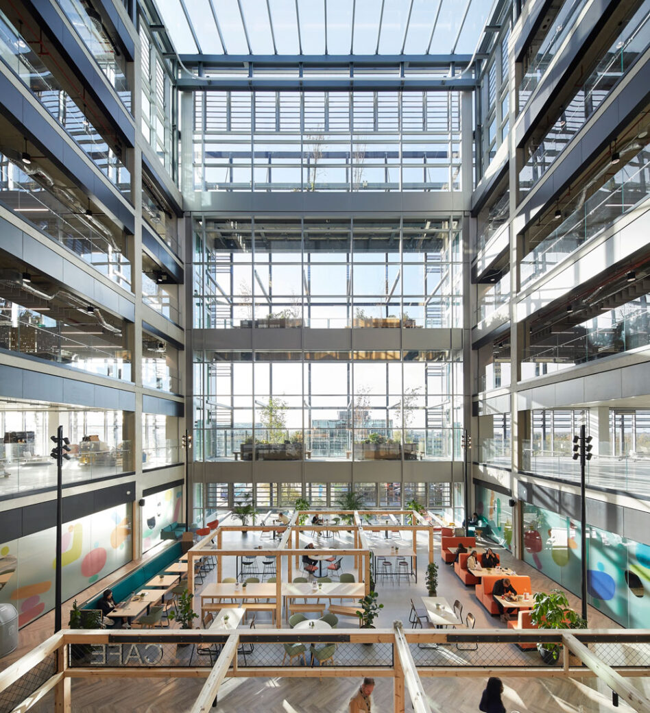 With design helmed by London-based firm LOM architecture and design, the newly opened Unity Place reimagines the corporate workplace by opening the mixed-use head office building for Santander UK to the public. Located in Milton Keynes, the eight-floor concept was designed as a destination for the wider community as well as the company’s 6,000 employees, with a floorplate that provides welcoming, agile workspaces and and promotes a collaborative ethos – with Milton Keynes University learning spaces and a spacious 70,000 sq ft co-working floor operated by flexible workspace providers x+why.