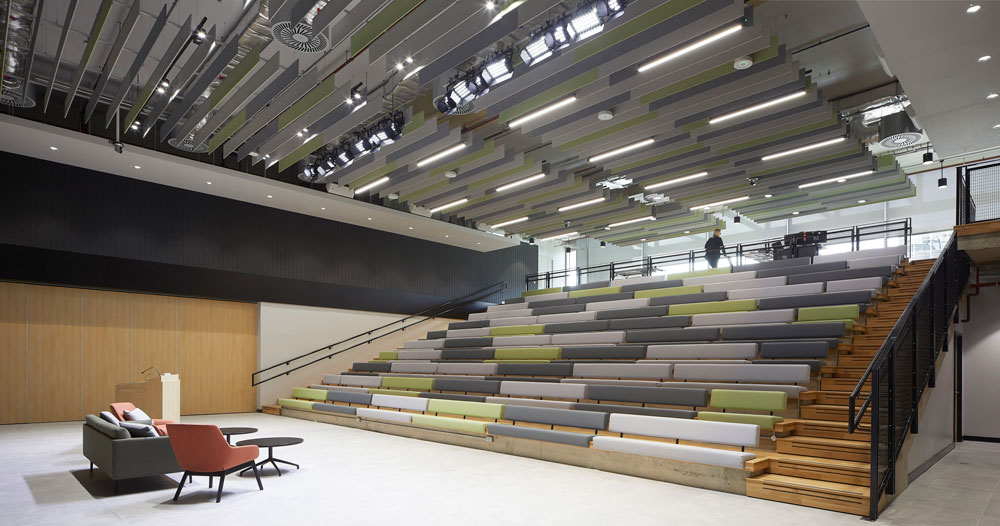 At Unity Place, a mixed-use head office building for Santander UK rubs shoulders with public realm spaces including a food market, auditorium and university learning spaces.